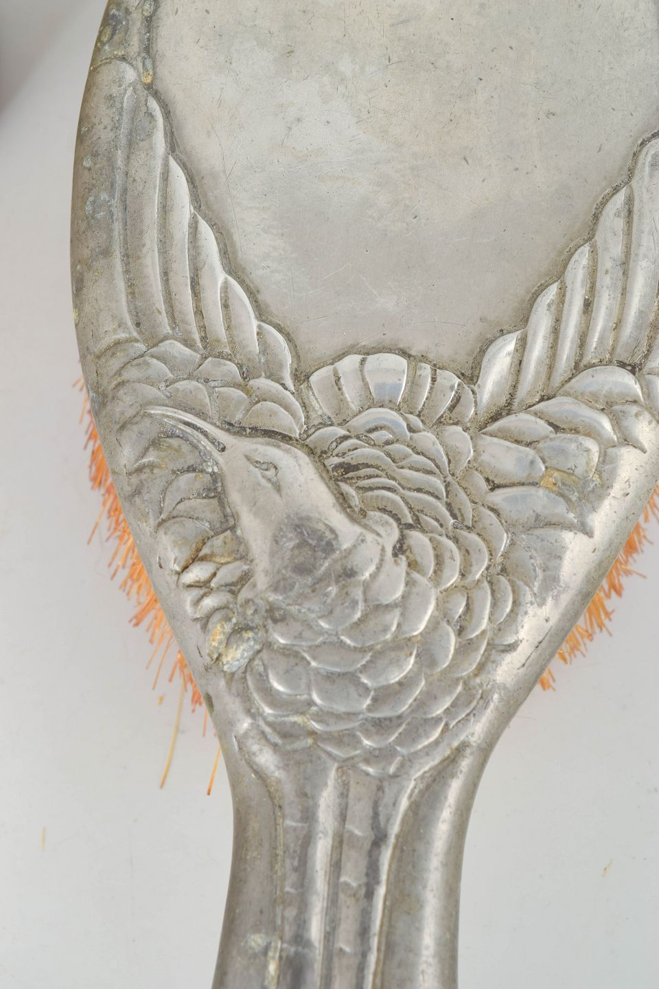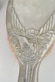 Børstesæt i tin udført i jugendstil med reliefdekoration af hejre og stiliserede naturmotiver. Består af to børster med dekorative skaftformer. Model Hejre.