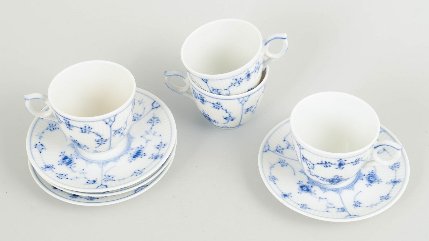 Sæt af fire mokkakopper med tilhørende underkopper i håndmalet porcelæn fra Musselmalet Riflet med klassisk underglasurdekoration i koboltblå.