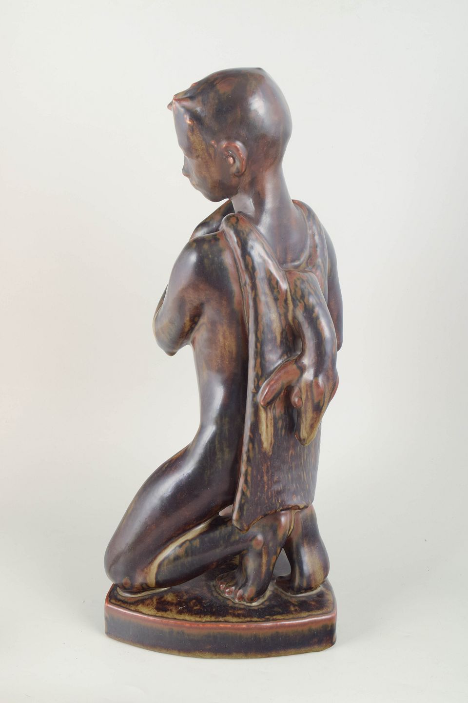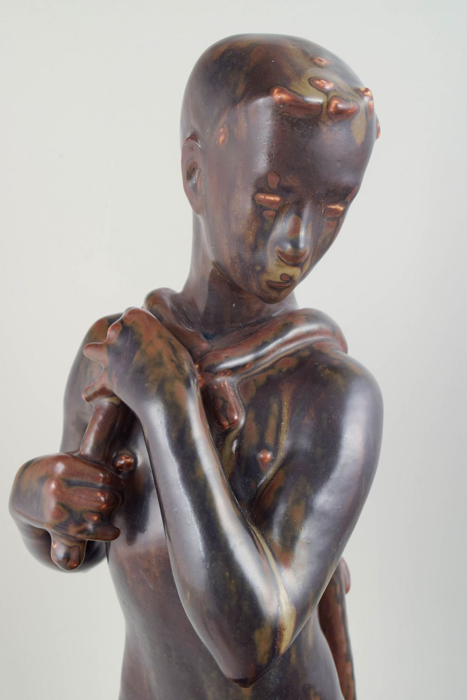 Imponerende monumental figur i stentøj, model 21096, udført i 1975 i begrænset oplag 2/15. Skulpturen fremstår naturalistisk modelleret med forenklede former og karakteristisk overfladebehandling, typisk for Johannes Hedegaards sene produktion hos Royal Copenhagen.