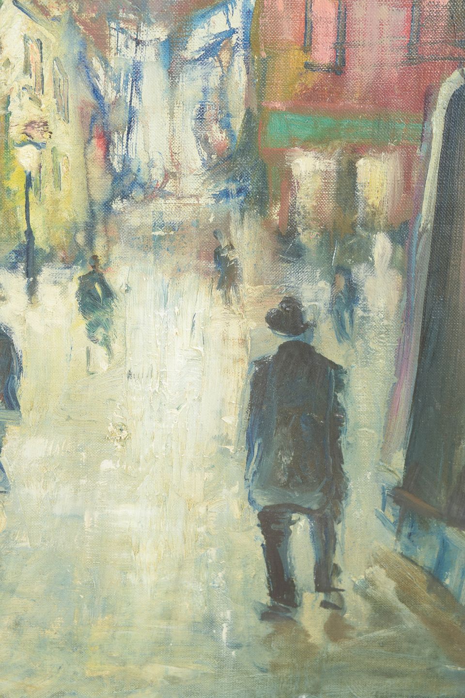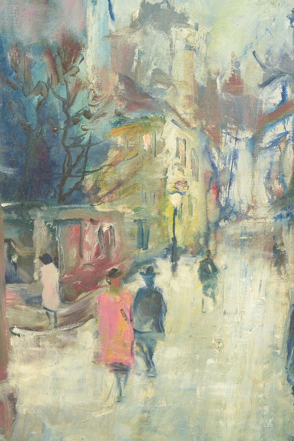 Impressionistisk gademotiv fra Montmartre i Paris med figurer i bevægelse langs en regnvåd boulevard, udført i en løs og atmosfærisk penselføring med dæmpede blå, okker og røde nuancer. Signeret Poul Kastrup.