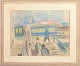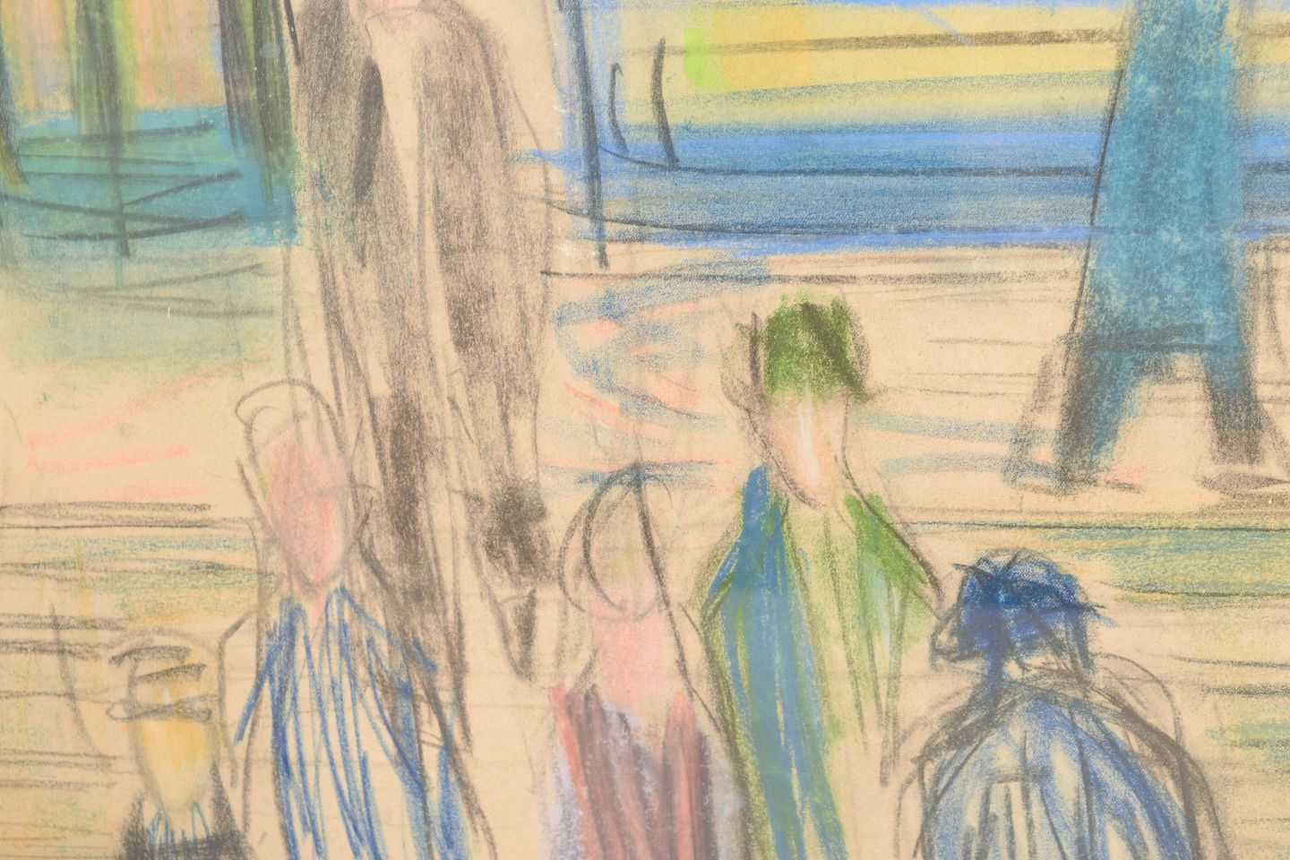 Expressive composition with figures and architectural elements executed in crayon on paper, signed B. Klercker lower right. The work presents a stylised urban scene with people and structures rendered in a loose modernist manner and a light, atmospheric colour palette.