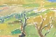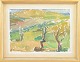 Modernist landscape composition executed with broad expressive brushwork, showing stylised trees and layered fields in green, yellow and earthy tones. Signed and dated 1955.