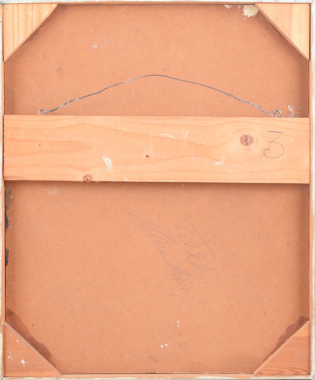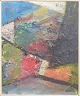 Abstrakt og ekspressiv komposition udført med kraftige penselstrøg og tyk farvepåføring i blå, røde, grønne og jordfarvede toner. Maleriet fremstår med en dynamisk struktur og tydelig materialitet i overfladen og er signeret samt dateret 1962.