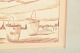 Figurativ komposition udført som blyanttegning med motiv af to fiskere, der arbejder med et net i et kystlandskab med både og huse i baggrunden.