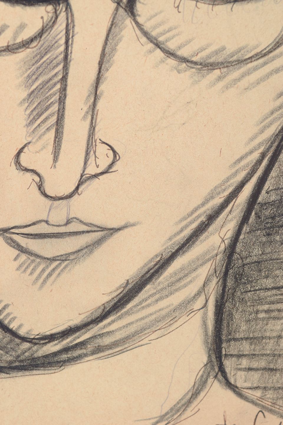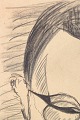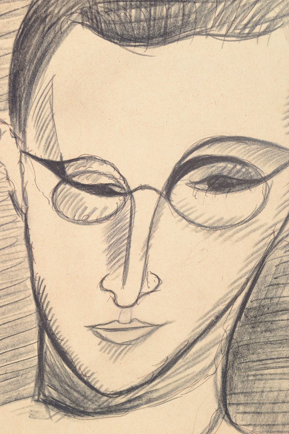 Art deco portrættegning udført på papir med markeret og rytmisk streg samt skraveringer, der skaber dybde i motivet. Portrættet viser en stiliseret mand med runde briller gengivet i en modernistisk og grafisk stil typisk for 1930’ernes avantgardetegning.