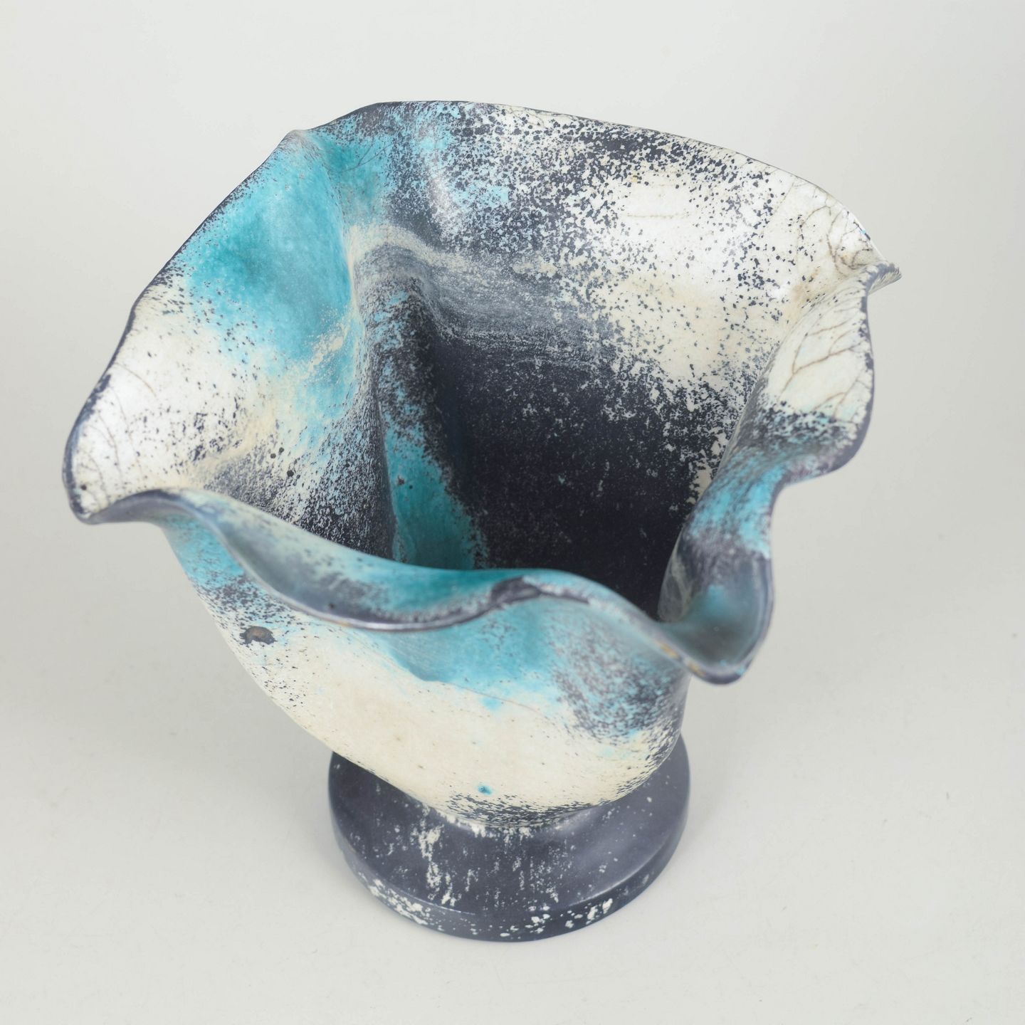 Decorative vase in glazed earthenware with a characteristic wavy rim and foot. Executed in a double glaze with green, turquoise, white and black tones, where the glaze flows dynamically across the surface creating a strong artistic expression.