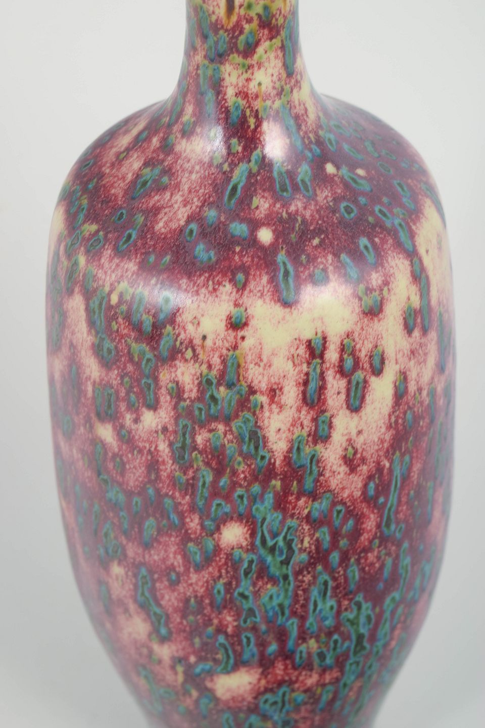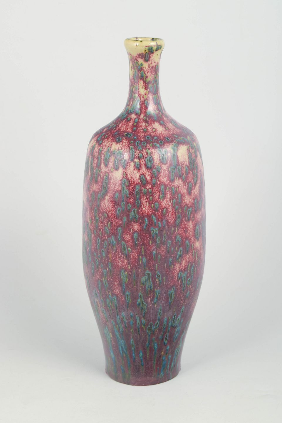 Slank, organisk formet vase i keramik med høj hals og levende krystalglasur i rosa, violette og turkise nuancer. Usigneret eksemplar.