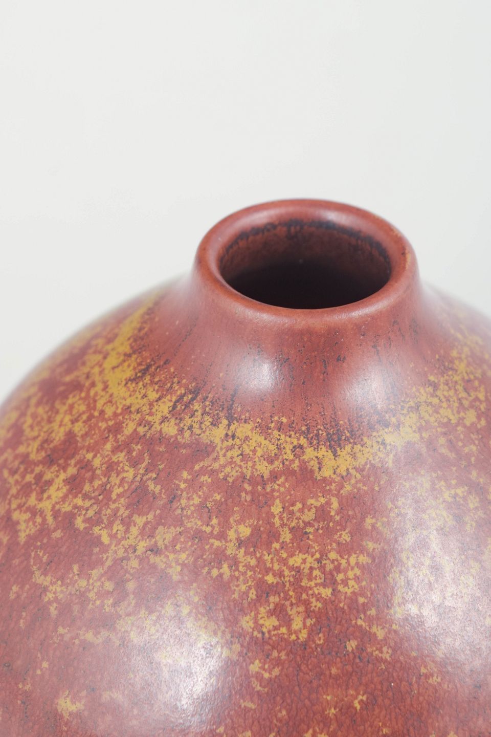 Organically shaped stoneware vase with rounded body and narrow neck, decorated with a deep reddish-brown glaze with golden tones.