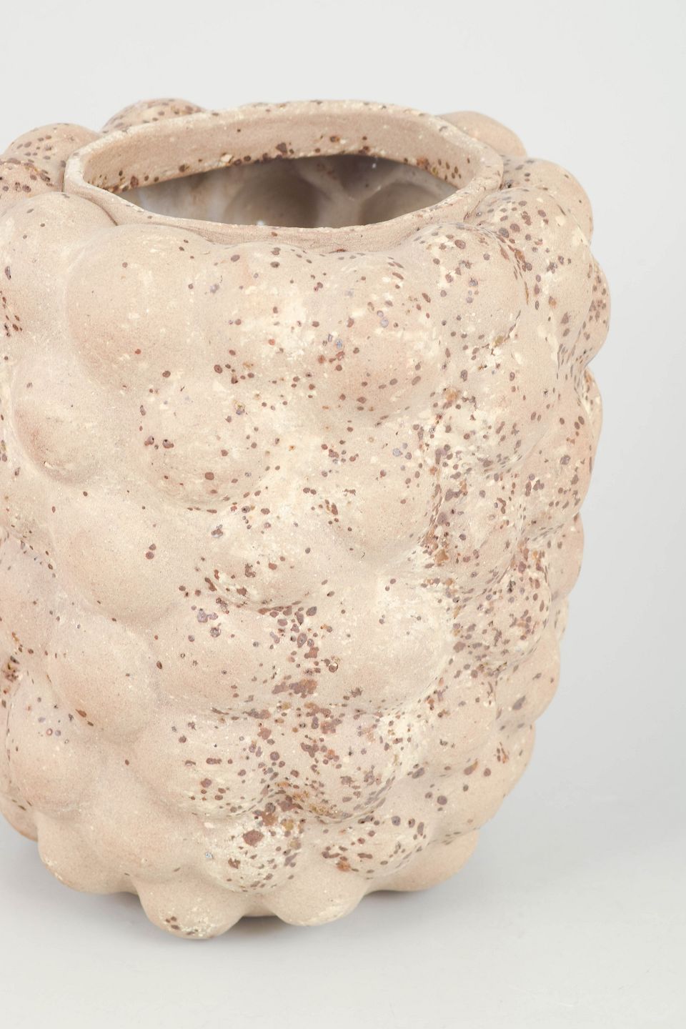 Unika stentøjsvase, organisk formet. Værket er uglaseret i kunstnerens signaturstil, hun har udarbejdet en teknik hvor leret vaskes ned så chamotten (små sorte og hvide emner i leret) fremstår meget synligt og får leret til at virke råt og smukt. Desuden er der tilført små lavastykker i overfladen.
