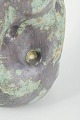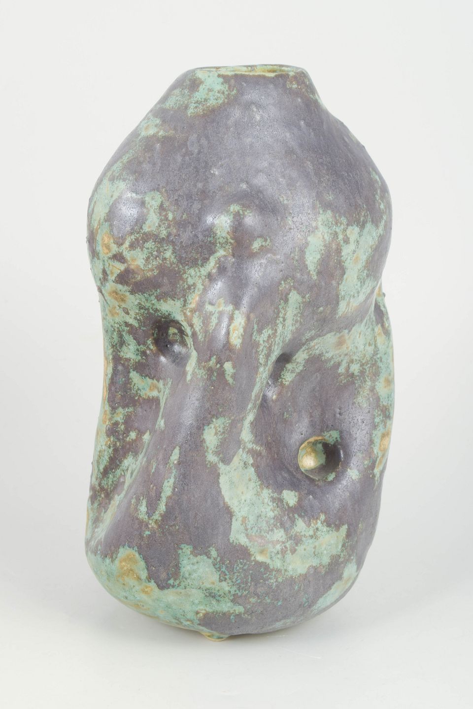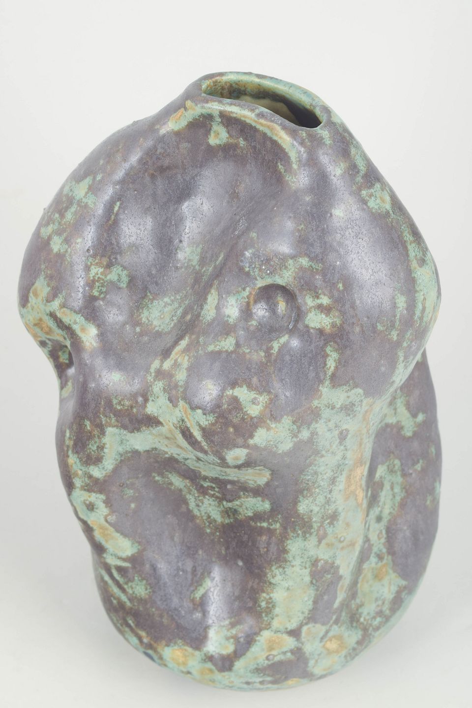 Unika stentøjsvase, organisk formet. Værket er glaseret i en kobbergrøn og sort, mat glasur.