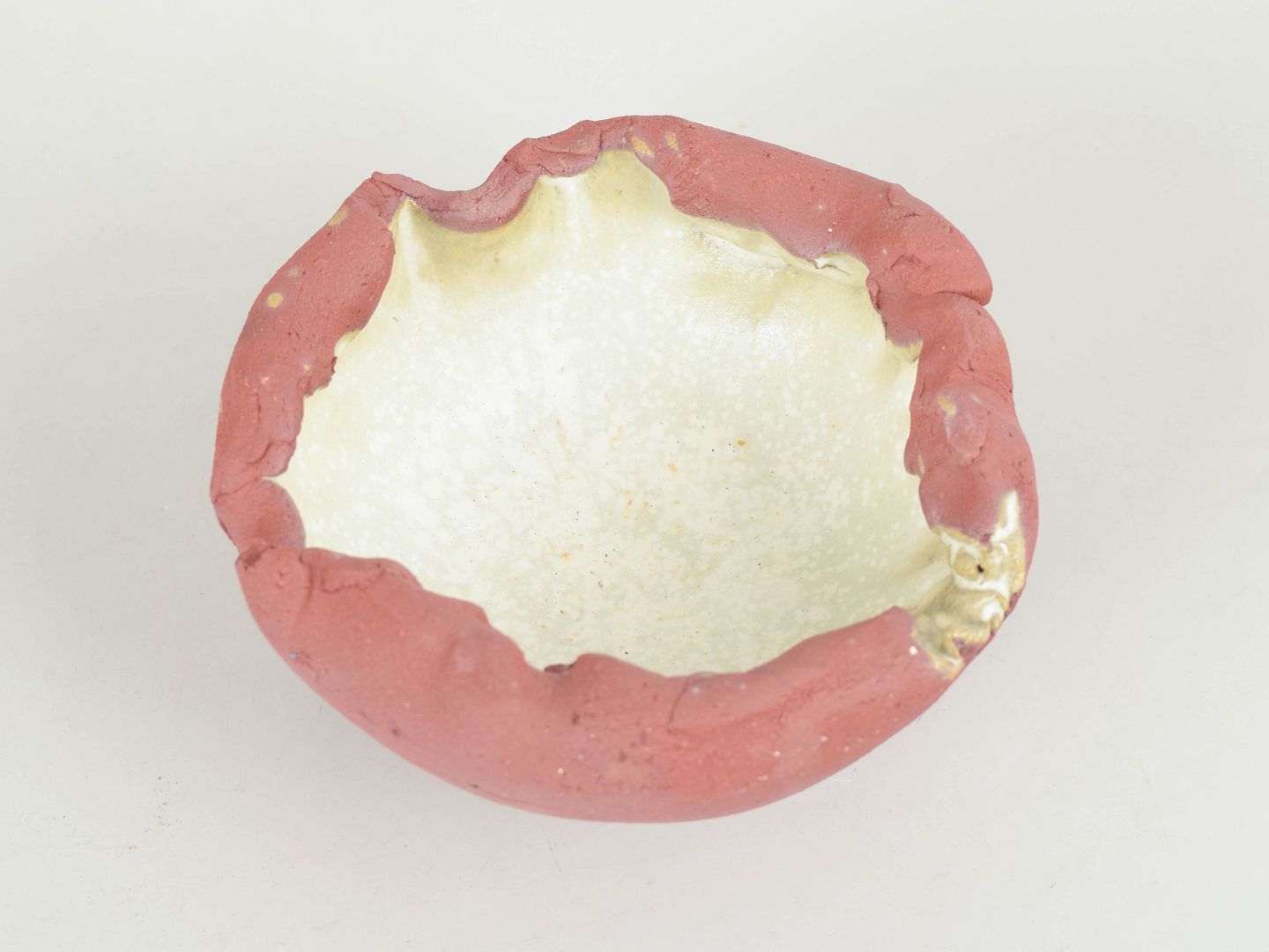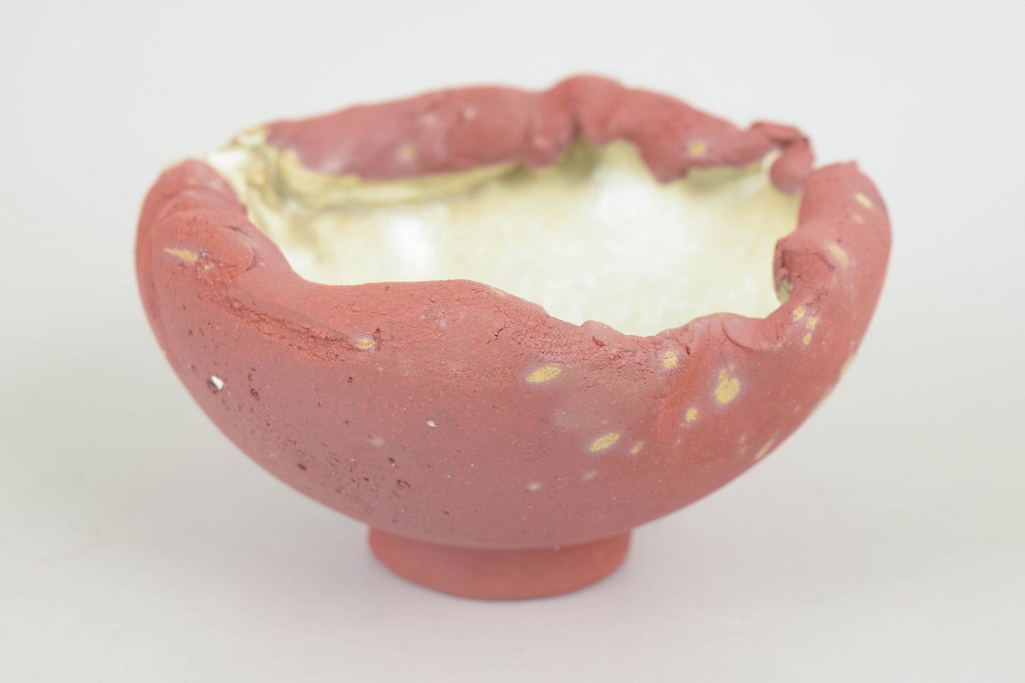 Lille unika skål i rødt stentøjsler på fod. Uglaseret på ydersiden fremstår den med det røde, varme ler som en kontrast til den cremehvide matte krystalglasur der optræder indvendigt.