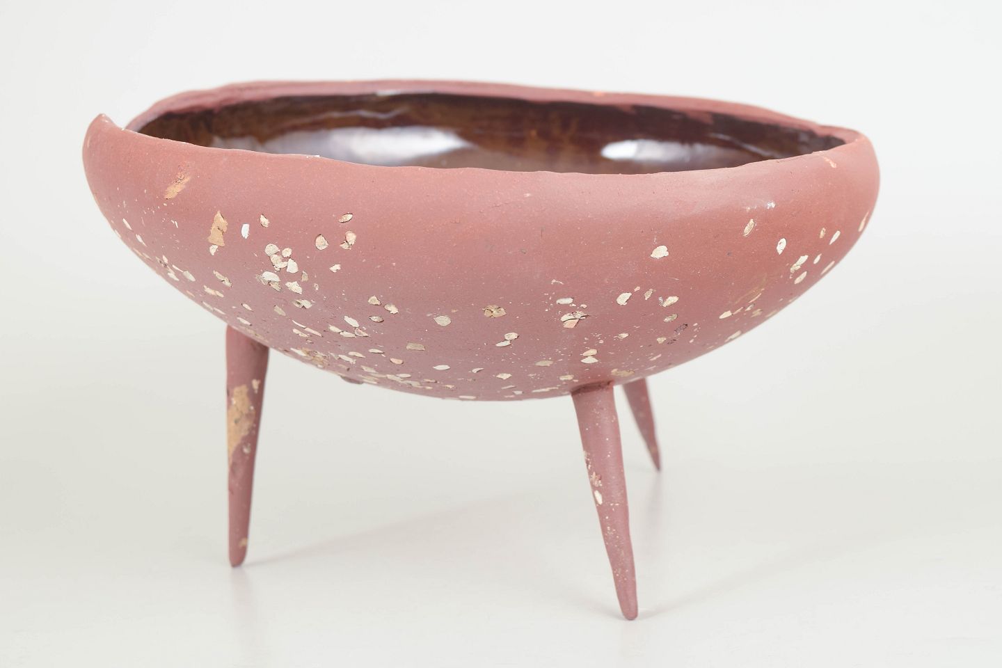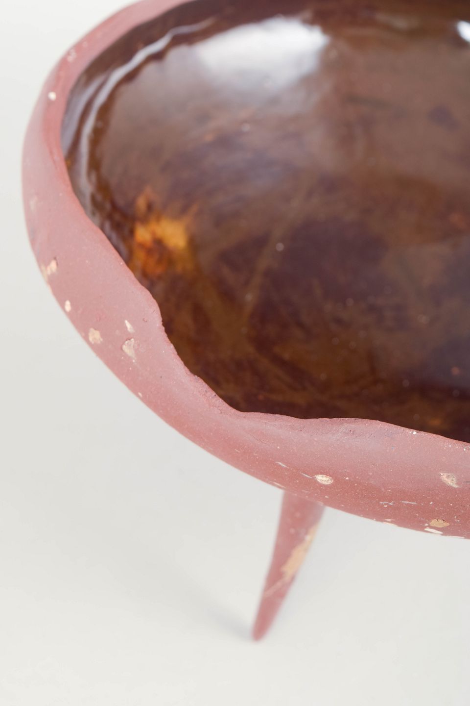 Unika Skål i rødt stentøjsler på tre spidse ben. Uglaseret på ydersiden fremstår den med det røde, varme ler som en kompliment til den mørke celadonglasur på indersiden af skålen.