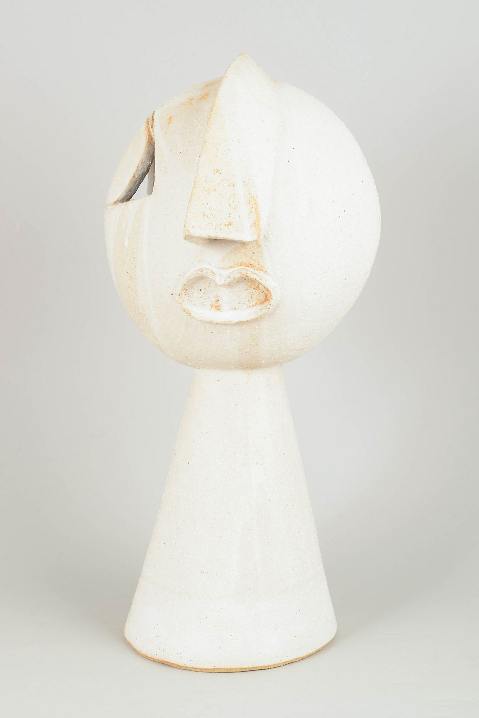 Christina Muff, dansk samtidskeramiker (f. 1971). Stort kubistisk unika ansigt med cremehvid mat glasur og farvede glasurløbere. "Fun times in moonshine" from the kilnfolk series.