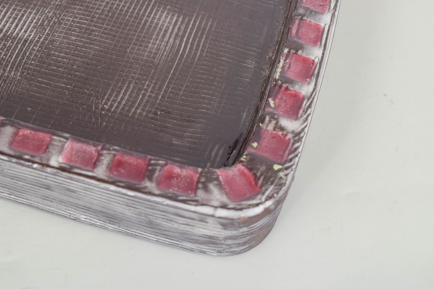 Kvadratisk fad i stentøj med mørk brun glasur i midten og dekorativ rand med relief og røde felter i gentagende mønster. Let struktureret overflade. Model 4156.