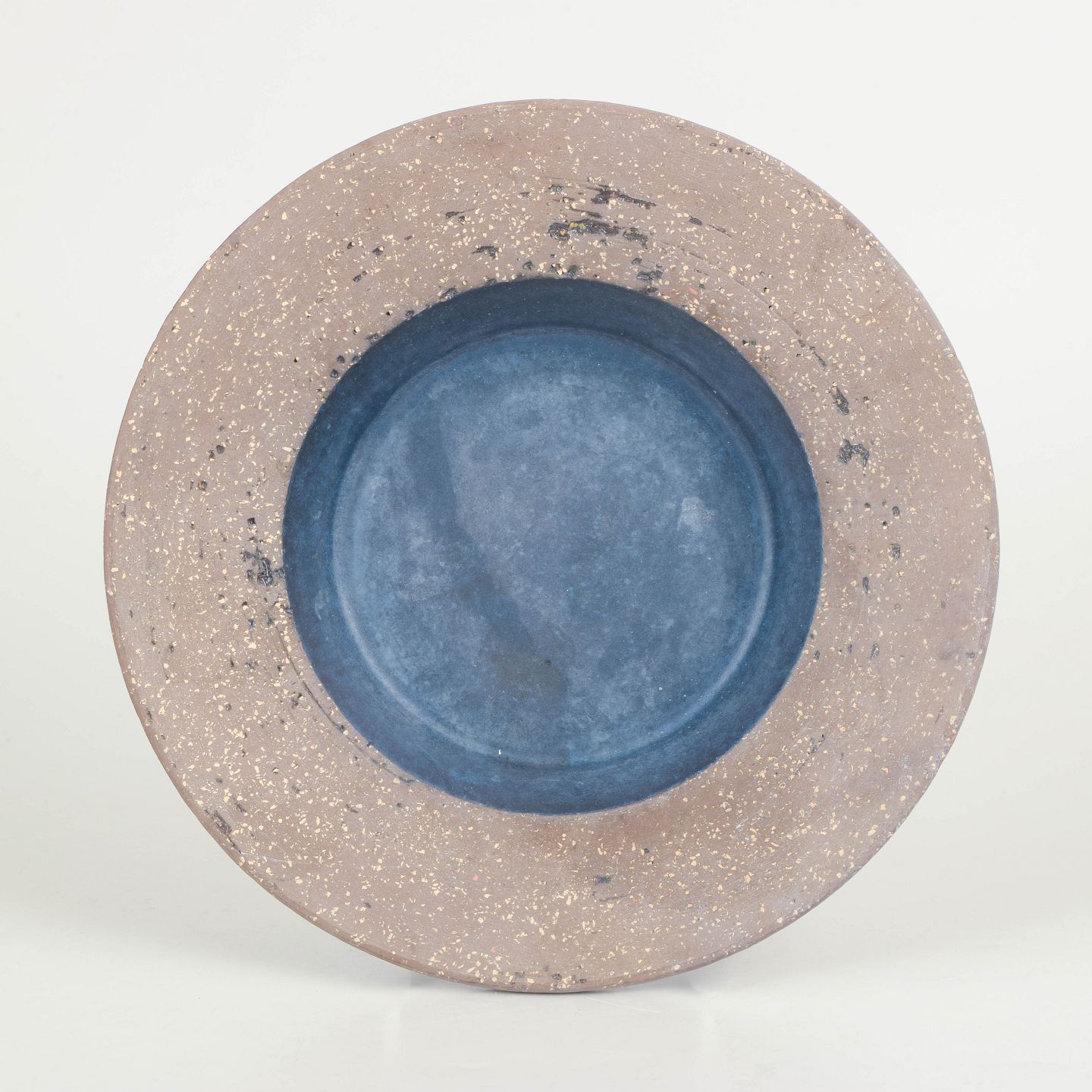 Dekorativt rundt fad i stentøj med mat glasur i blå og sandfarvede toner samt spraglet overflade. Model 4070B.