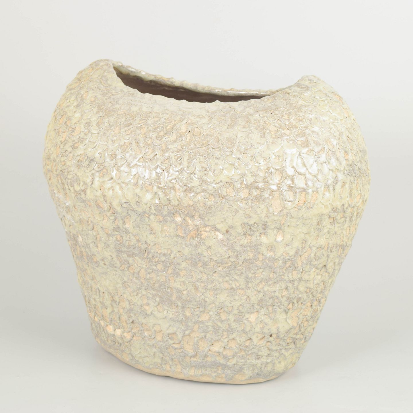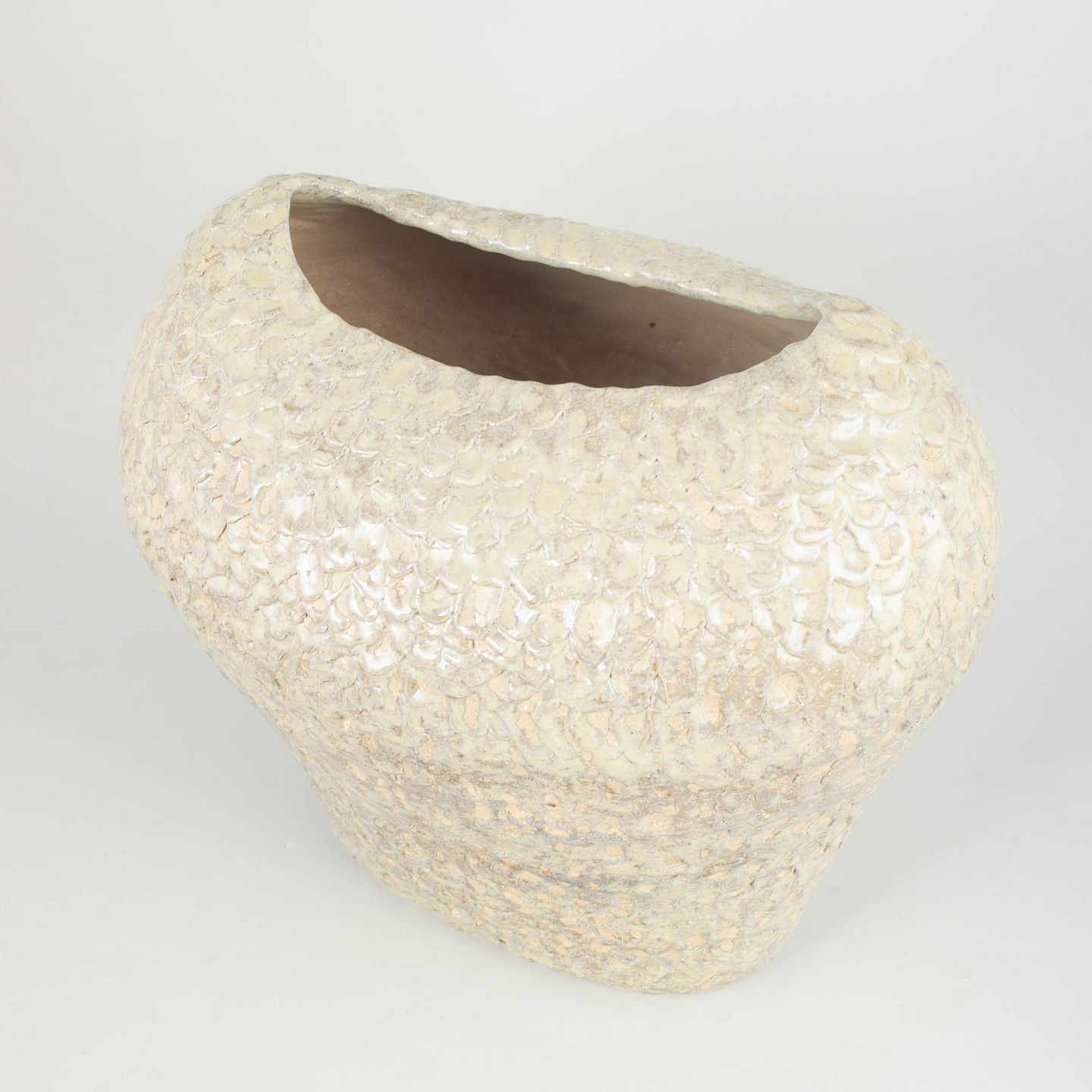 Stor unika rund stentøjsvase. Værket er uglaseret i kunstnerens signaturstil med blandede lertyper af genbrugsler. Leret er sammensat med tusindvis af små tryk med fingrene, dette giver værket et taktilt, organisk og blødt udtryk.