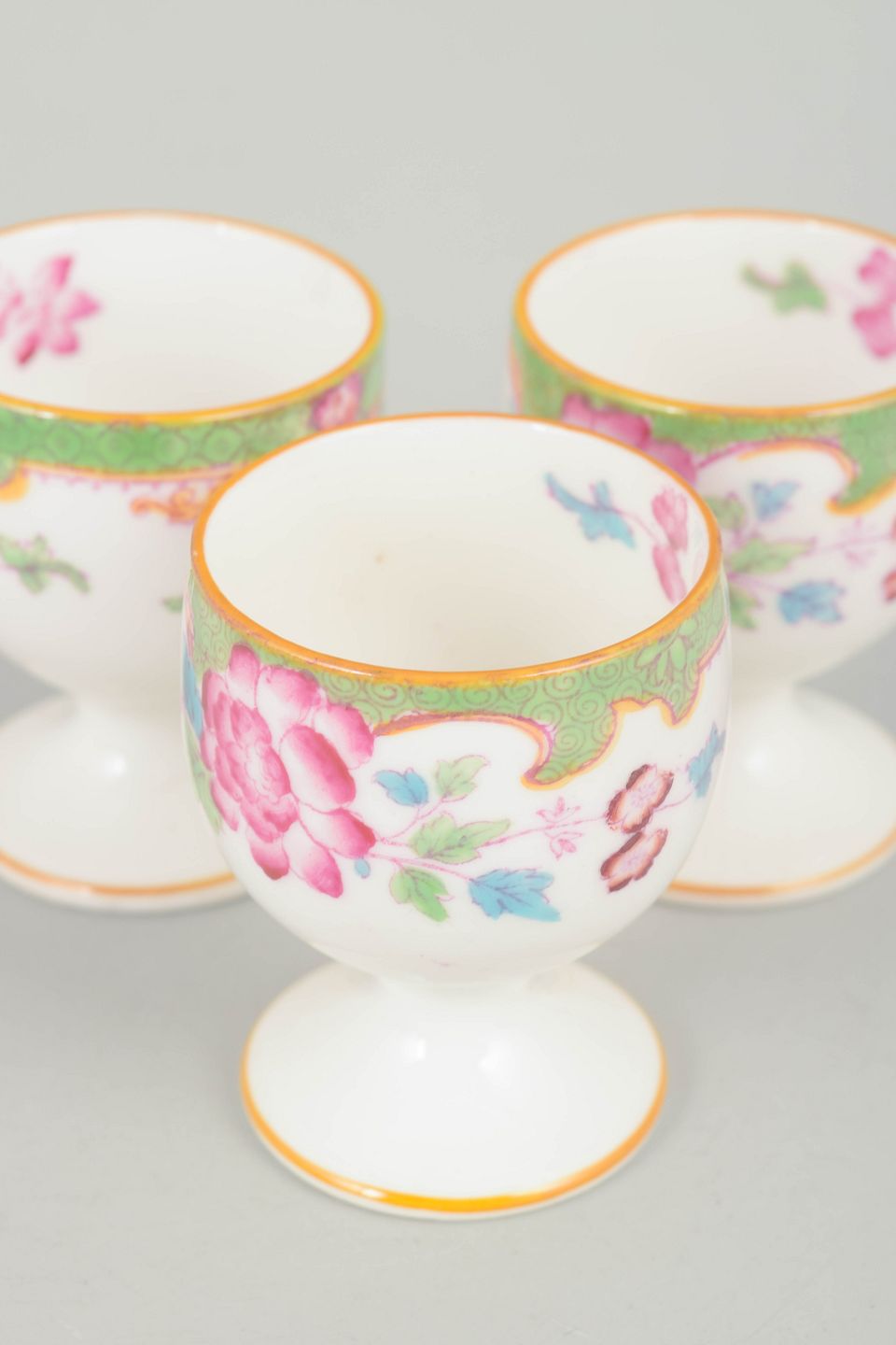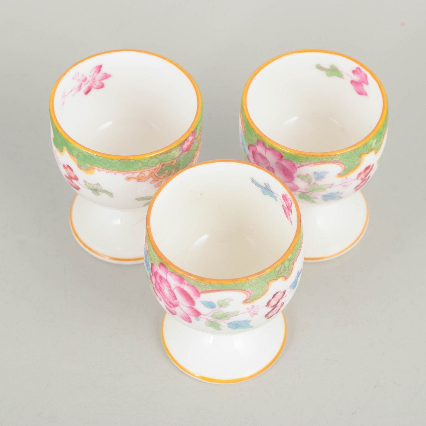 Dekorative æggebægre i porcelæn med farverig blomsterdekoration i Temple mønster og karakteristisk grøn bort.