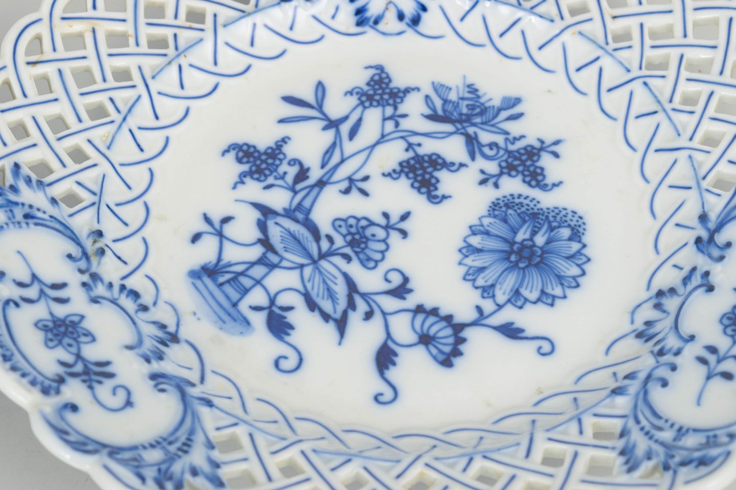 Klassiske middagstallerkener i porcelæn med gennembrudt fane og blå løgmønstret dekoration i underglasur. Elegant håndmalet udtryk med fin detaljering.