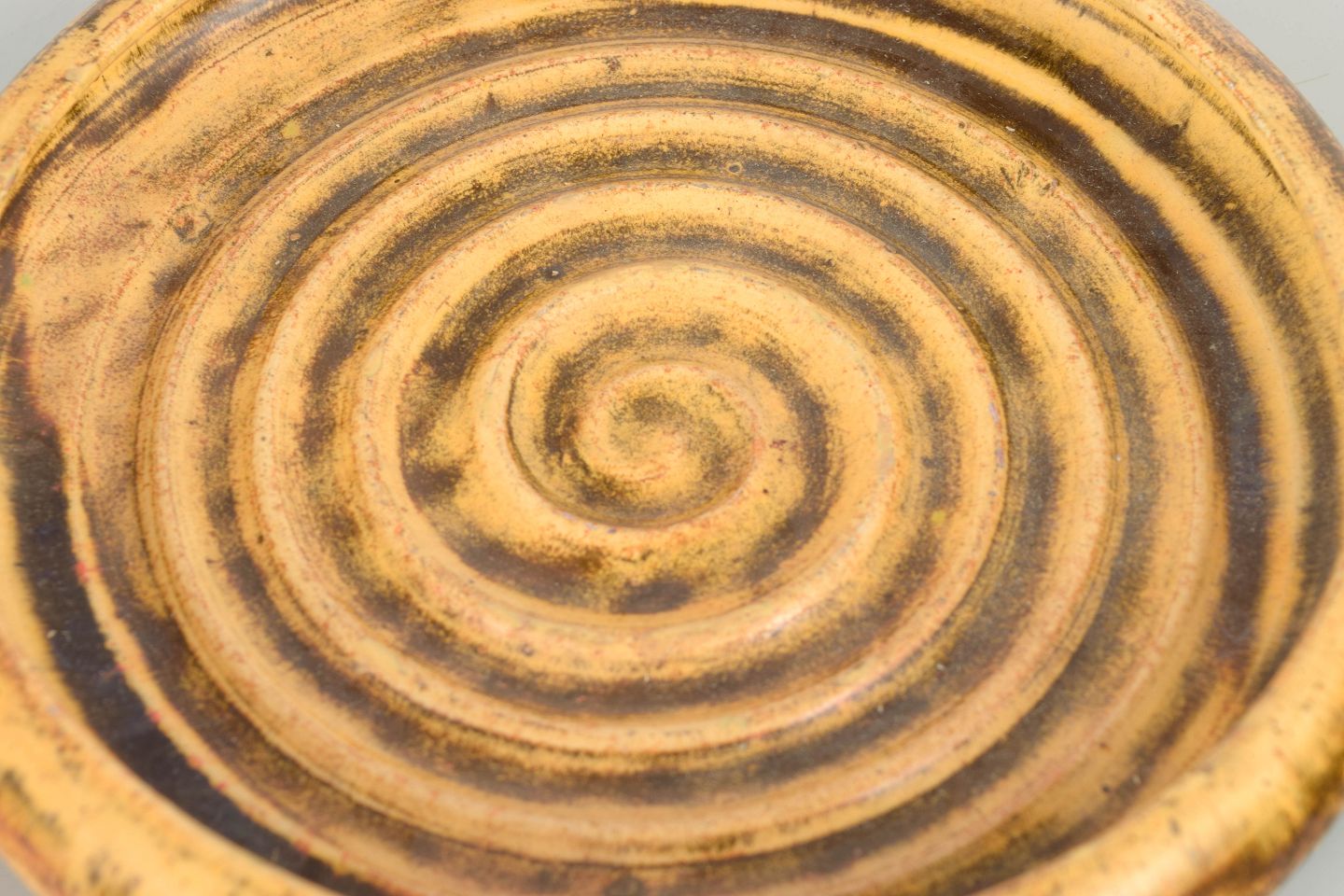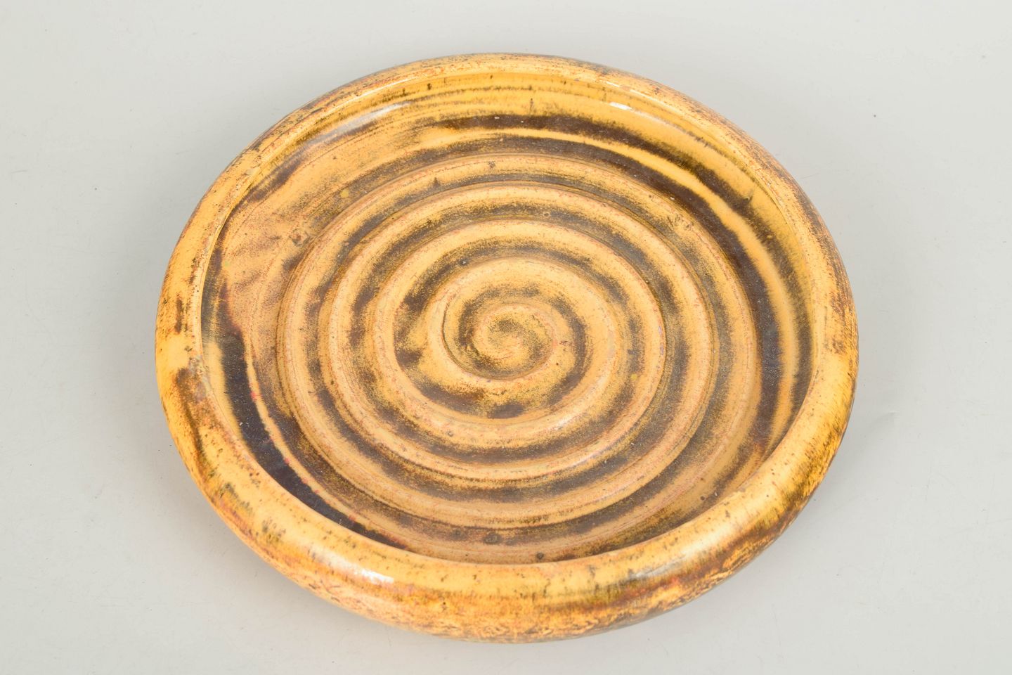 Decorative stoneware dish with characteristic spiral ornamentation and uranium glaze in golden and brown tones. A strong example of Hammershøi’s design language and experimental glaze work from the 1930s. Marked on the base.