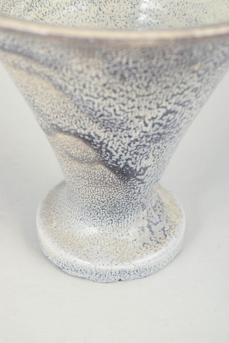 Dekorativ vase i stentøj med karakteristisk trompetform og dobbelt glasur i sorte og grå nuancer. Eksempel på Hammershøis sikre formsprog og subtile glasurarbejde fra 1930’erne. Stemplet i bunden.