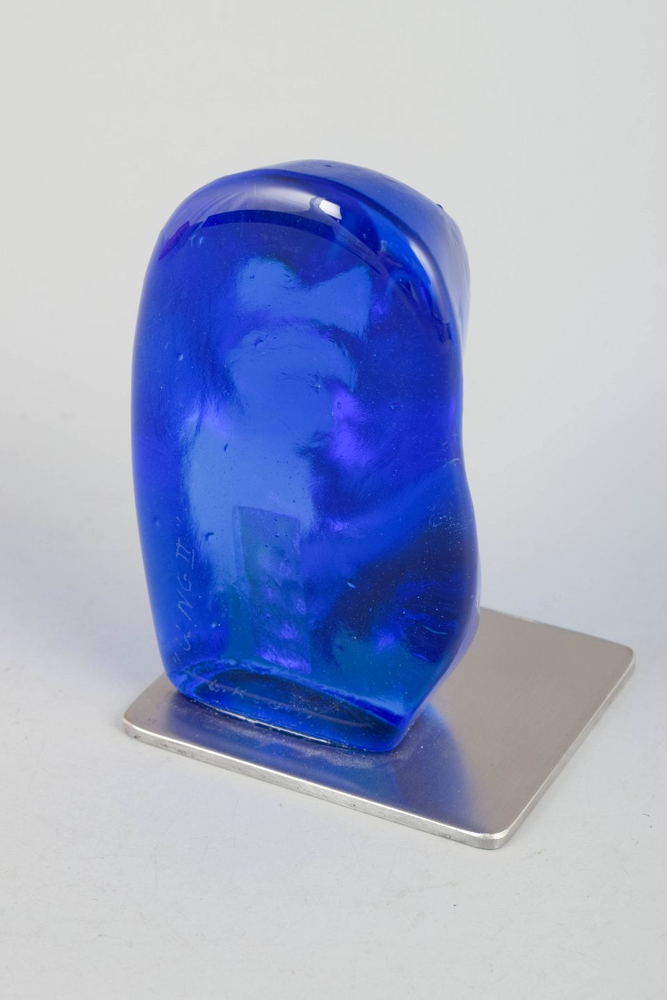 Organisk formet skulptur i mundblæst glas med dyb blå farve og indkapslede figurative elementer. Signeret af kunstneren og udført i eget værksted.