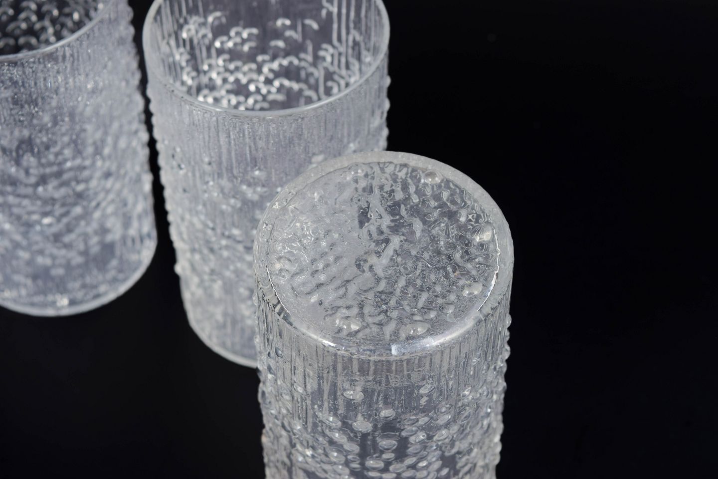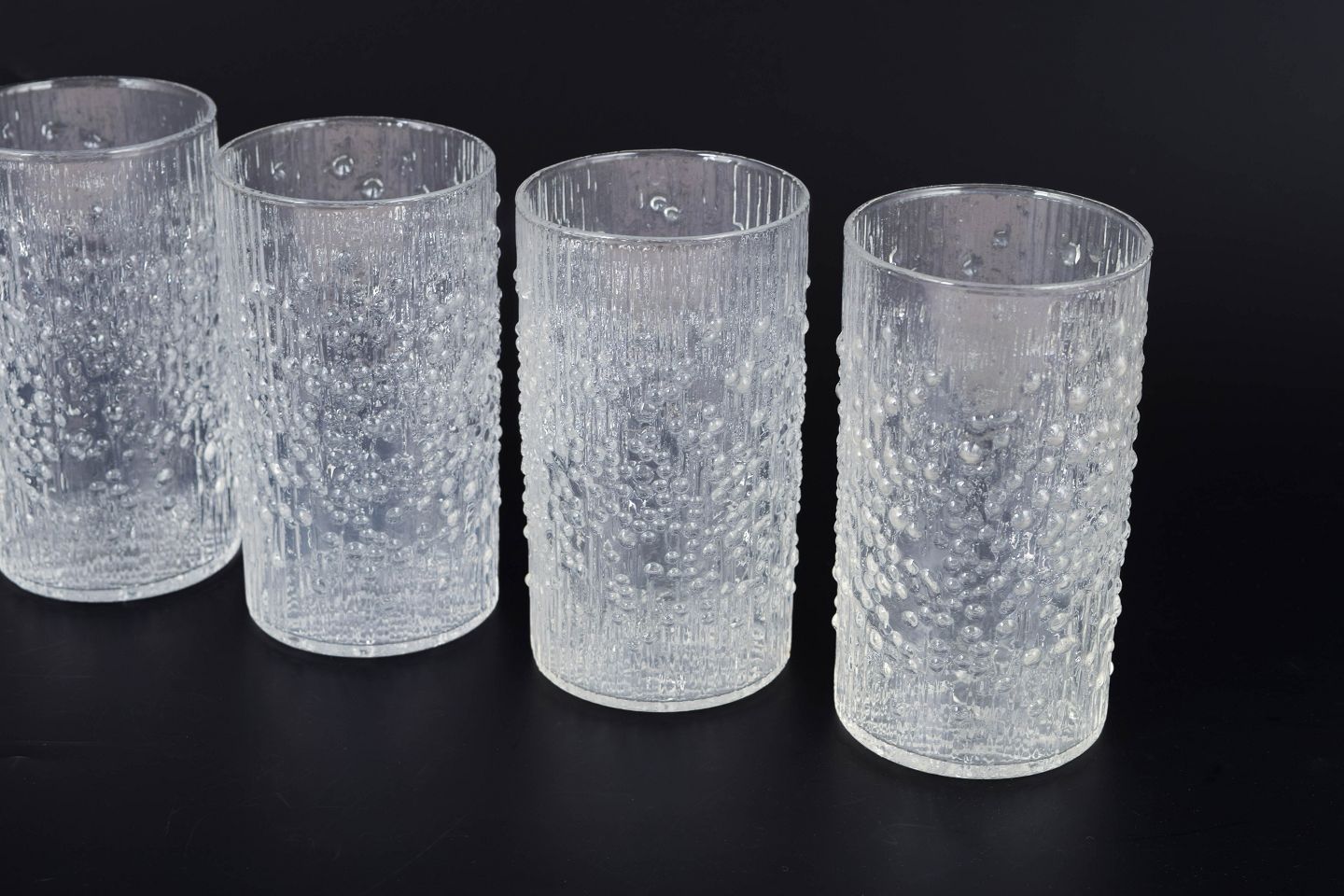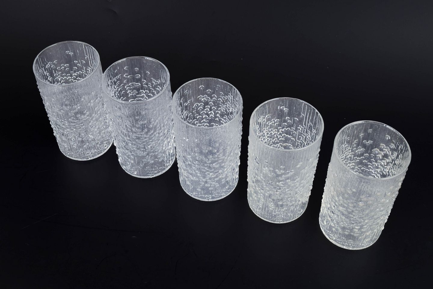 Sæt af fem drikkeglas i presset glas med karakteristisk organisk struktur og reliefmønster, der skaber et levende lysspil i overfladen. Designet er et klassisk eksempel på finsk glasdesign fra perioden. Model Hopla i klart glas.