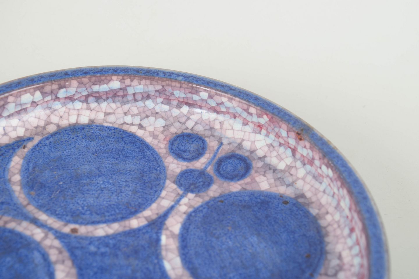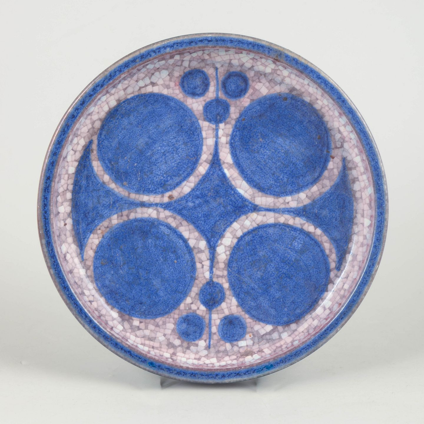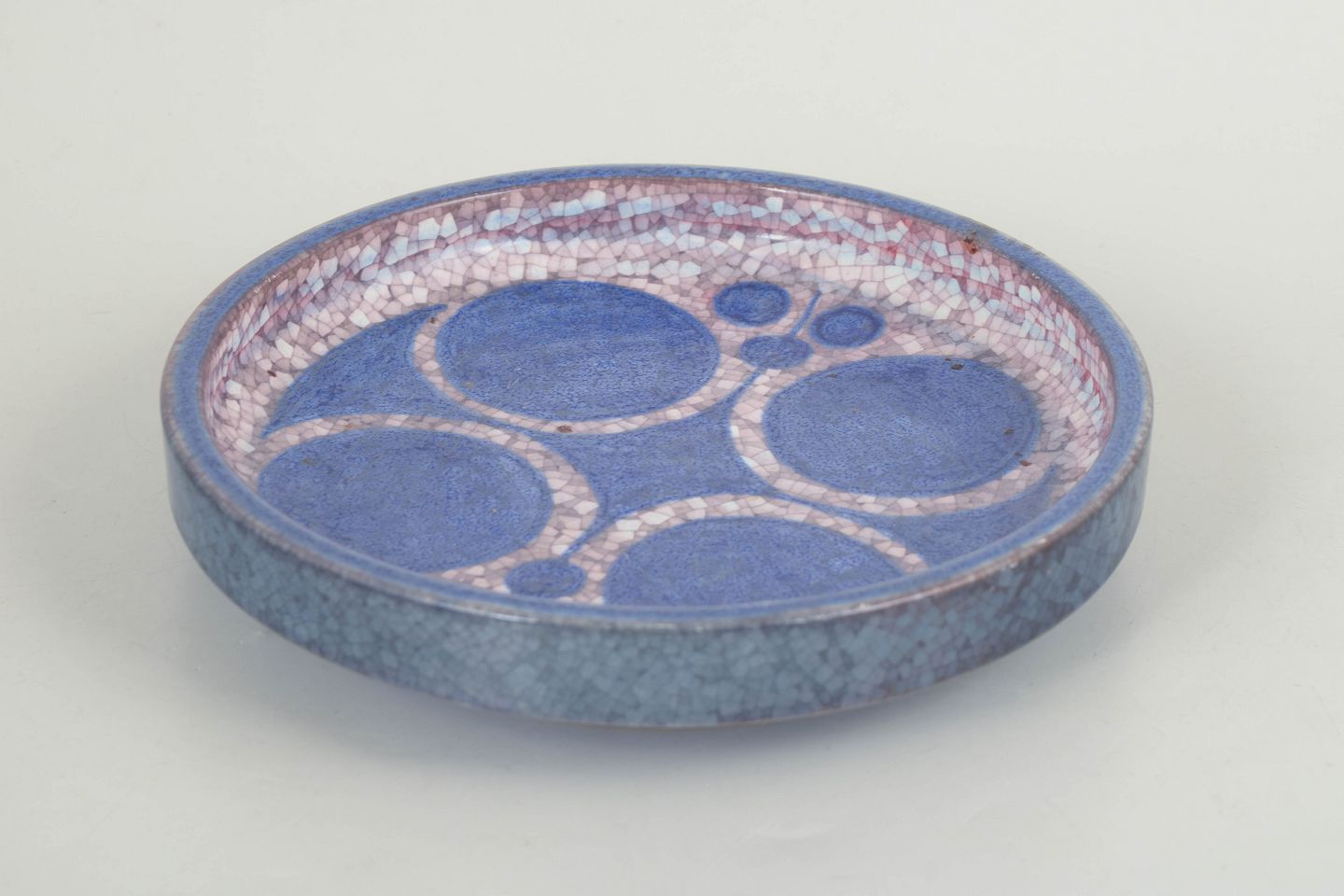 Decorative stoneware dish with circular relief pattern in blue glaze. The motif consists of repeated ring forms with fine texture, characteristic of Marianne Starck’s work for Michael Andersen & Søn. Marked on the base.