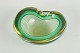 Organisk formet skål i mundblæst glas med bløde, afrundede linjer og transparent grøn farve med indlejrede nuancer i klart og gyldent glas.