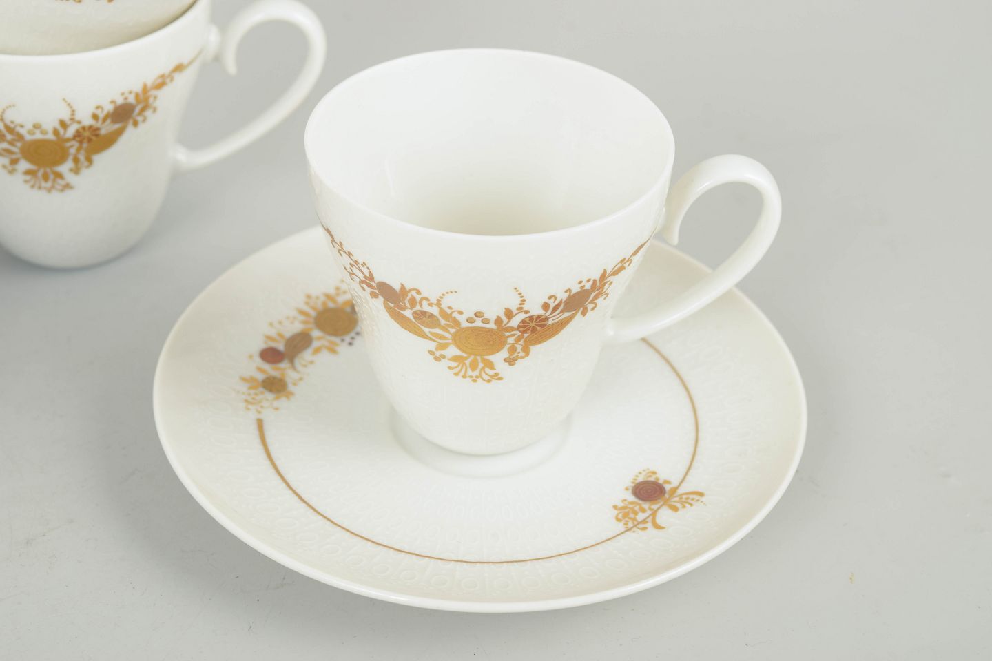 Sæt bestående af fire kaffekopper med tilhørende underkopper i porcelæn dekoreret med det karakteristiske blomsterornament fra Romanze-serien. Dekorationen fremstår i gyldne nuancer med fine detaljer og et elegant, romantisk udtryk, typisk for Wiinblads formsprog i 1970’erne.