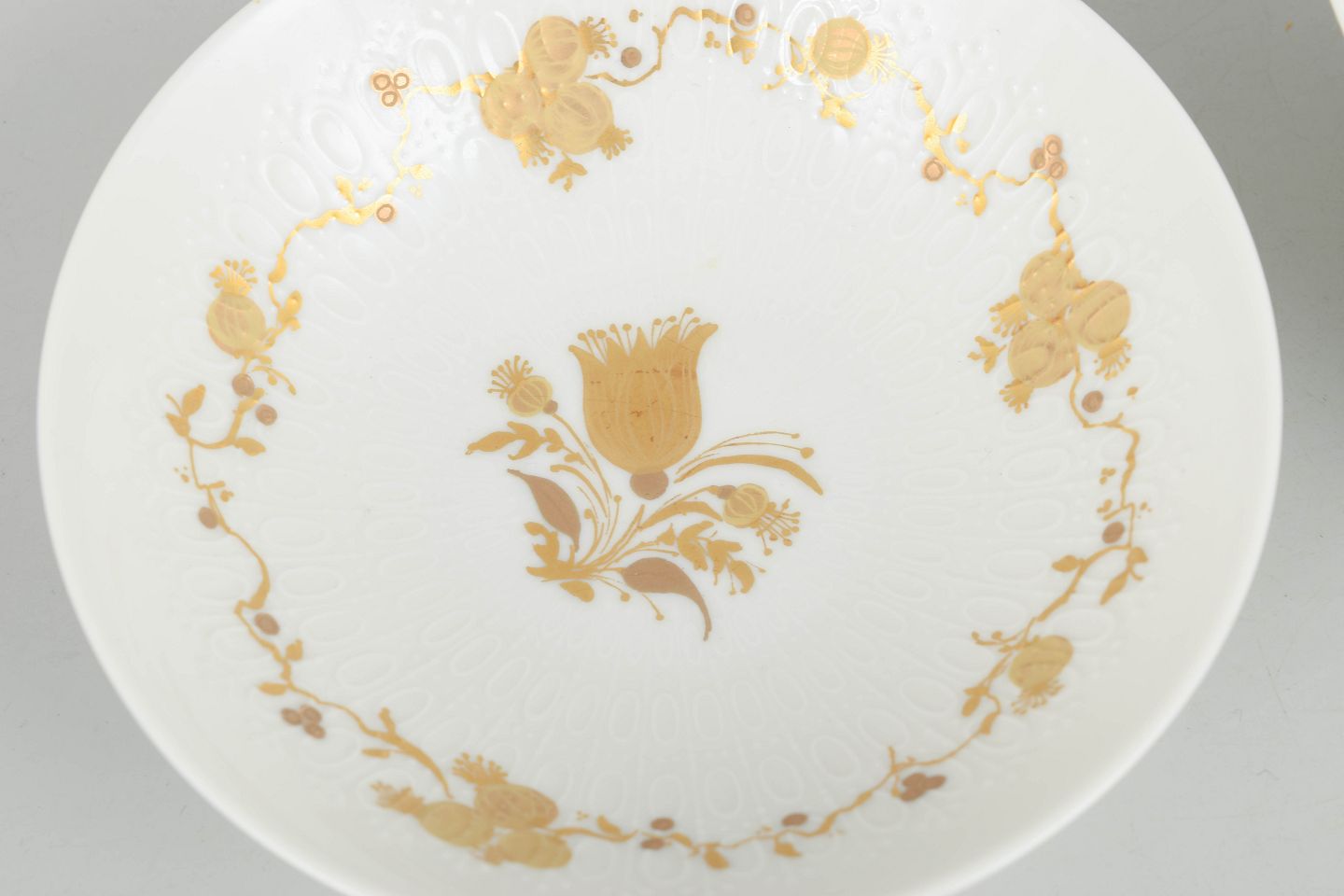 Sæt bestående af to skåle i porcelæn dekoreret med det karakteristiske blomsterornament fra Romanze-serien. Dekorationen fremstår i gyldne nuancer med fine detaljer og et elegant, romantisk udtryk, typisk for Wiinblads formsprog i 1970’erne.