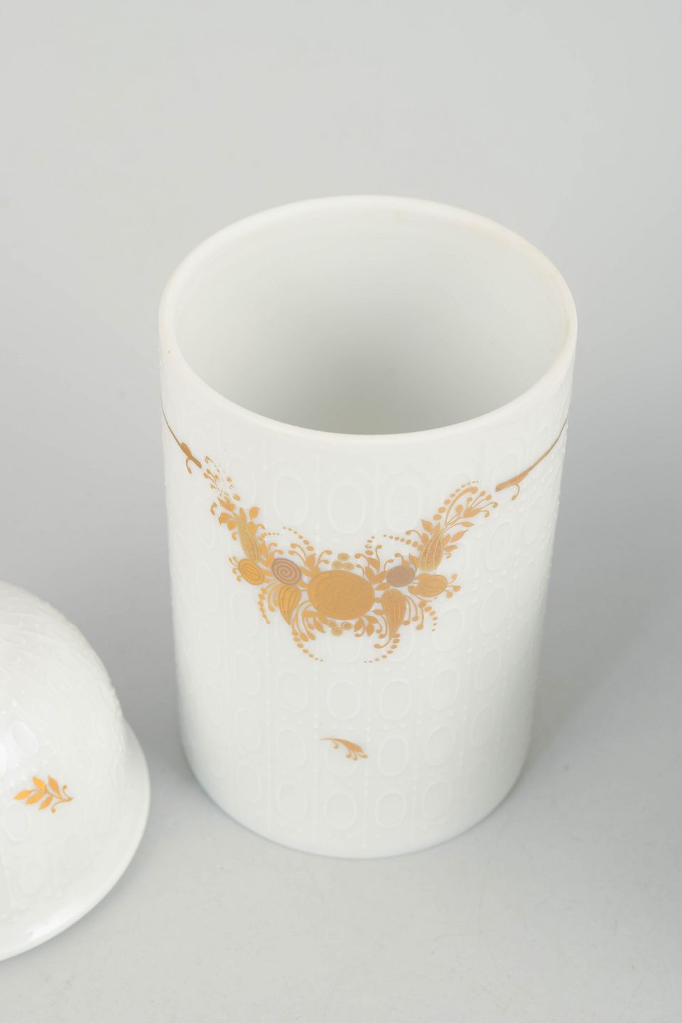 Sjældent sæt bestående af lysestage og tedåse med låg i porcelæn, dekoreret med det karakteristiske romantiske blomsterornament fra Romanze-serien. Elegant formsprog med fine gulddetaljer, typisk for Wiinblads dekorative univers i 1970’erne.