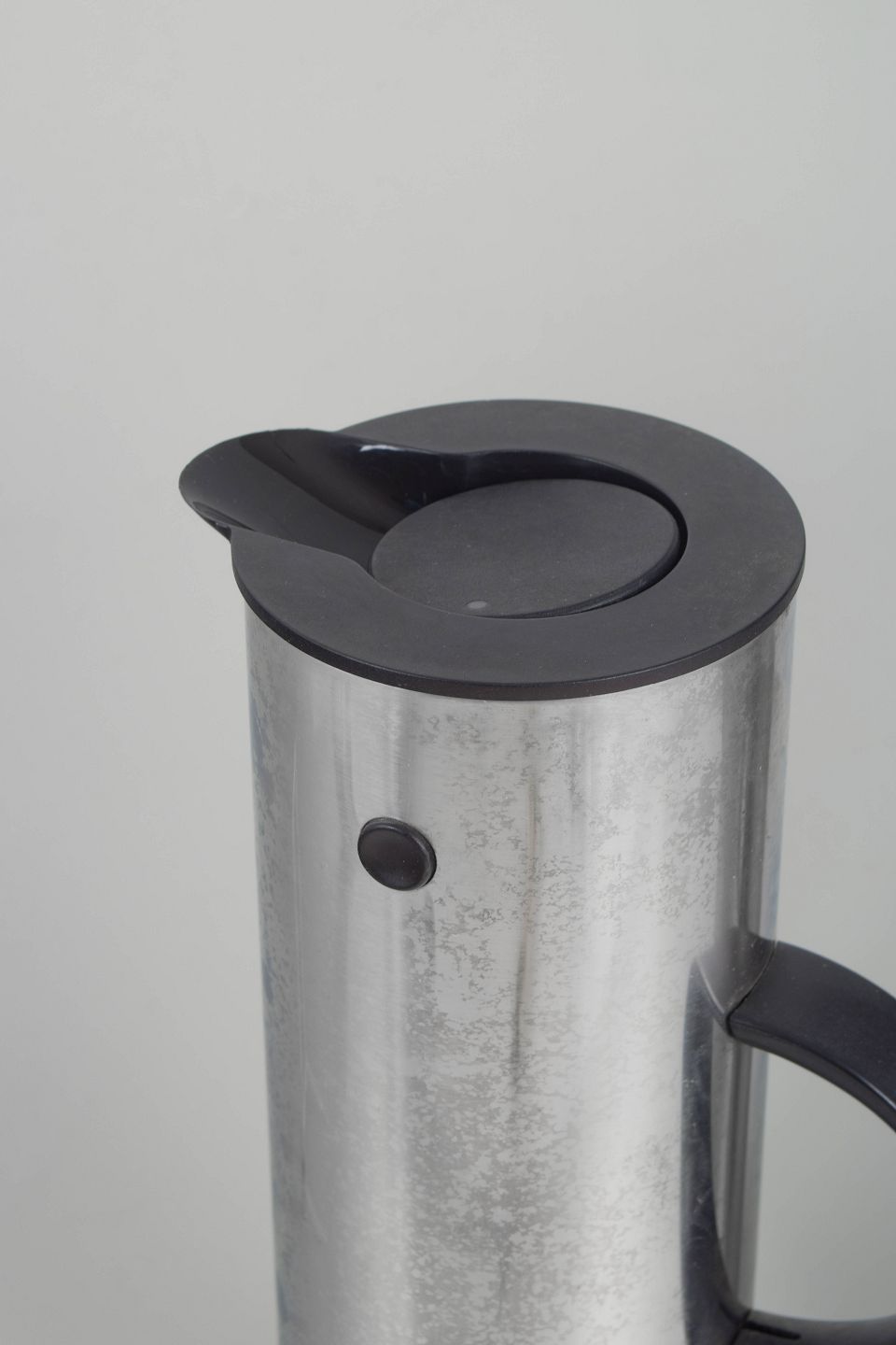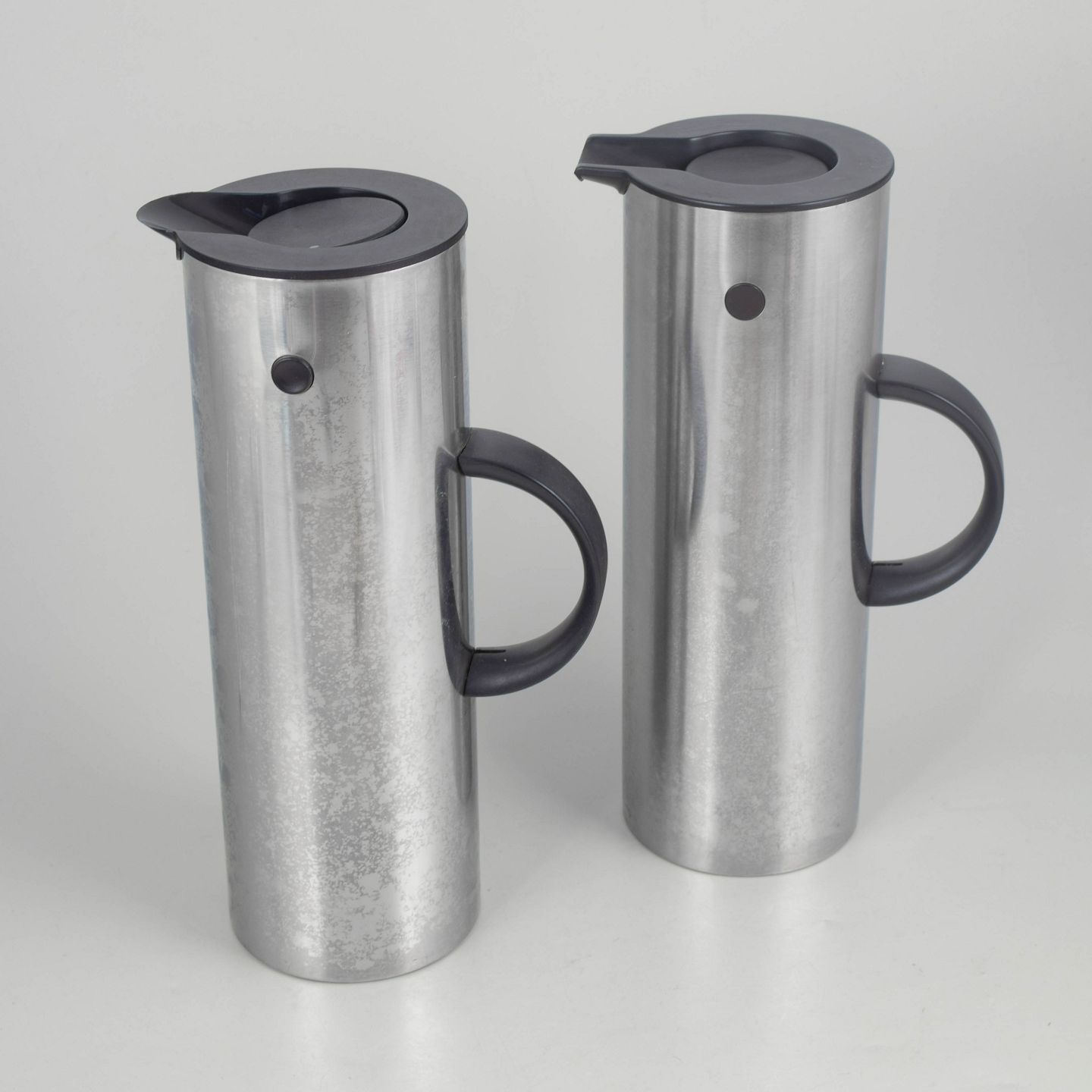 To cylindriske termokander i børstet rustfrit stål med karakteristisk vippeprop og sort kunststofhank. Model fra Steltons ikoniske serie, designet med fokus på funktionalitet og minimalistisk formgivning.