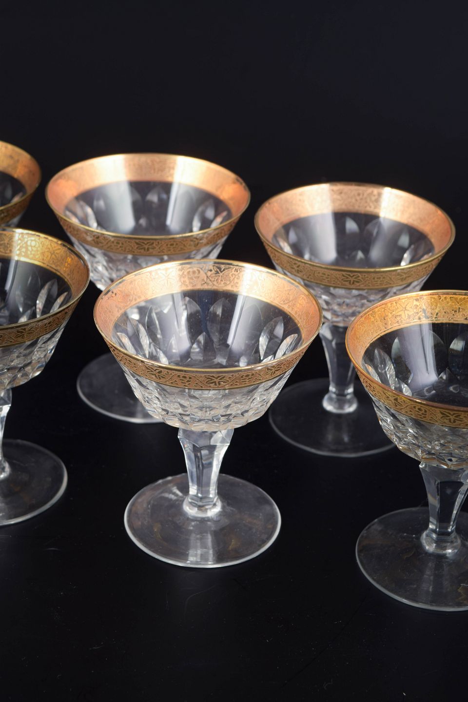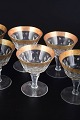 Elegante likørglas i facetslebet krystal med dekoration i 24 karat guld langs kanten, udført i klassisk midten af det 20. århundrede stil.