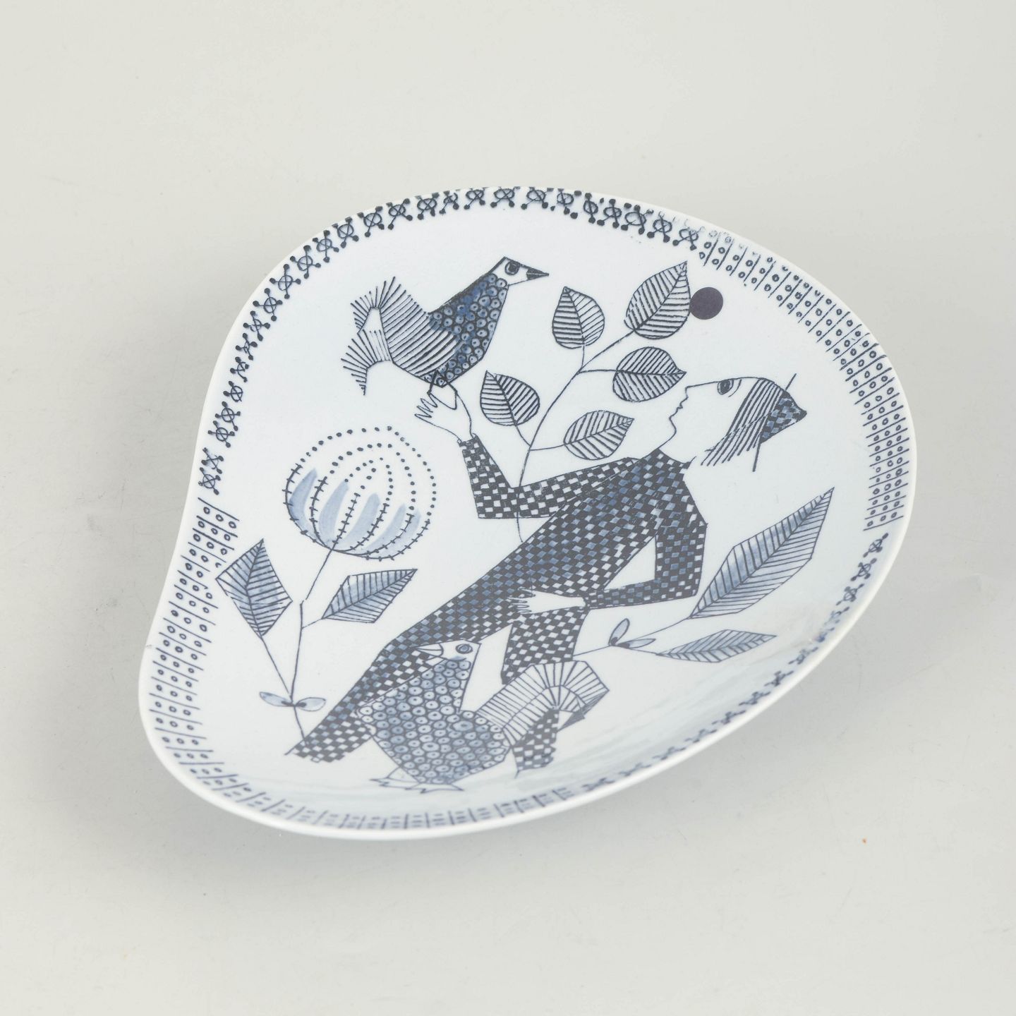 Dekorativt keramisk fad med stiliseret figur- og naturmotiv i sort på hvid bund, udført med grafisk præcision og karakteristisk for Leuchovius’ arbejde med fortællende dekorationer.