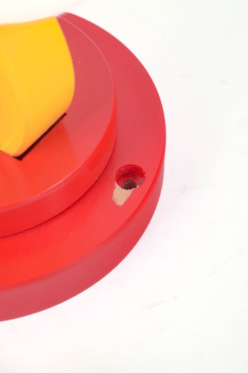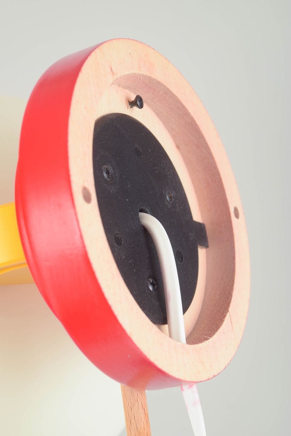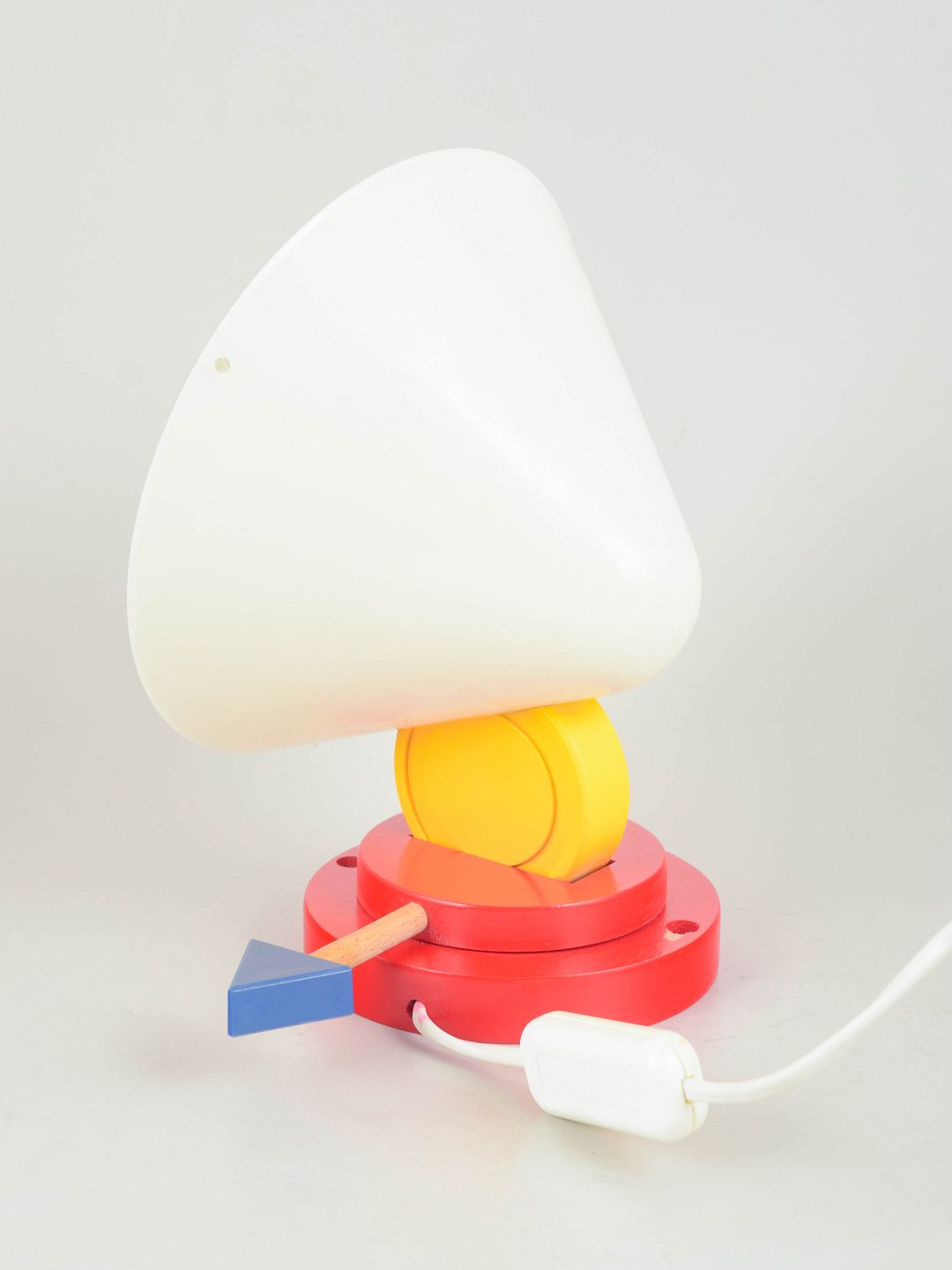 Geometrisk formet lampe i lakeret træ og plast med stærke kontrastfarver i rød, gul, blå og hvid. Kan anvendes både som væglampe og bordlampe, karakteristisk for 1980’ernes postmoderne formsprog.