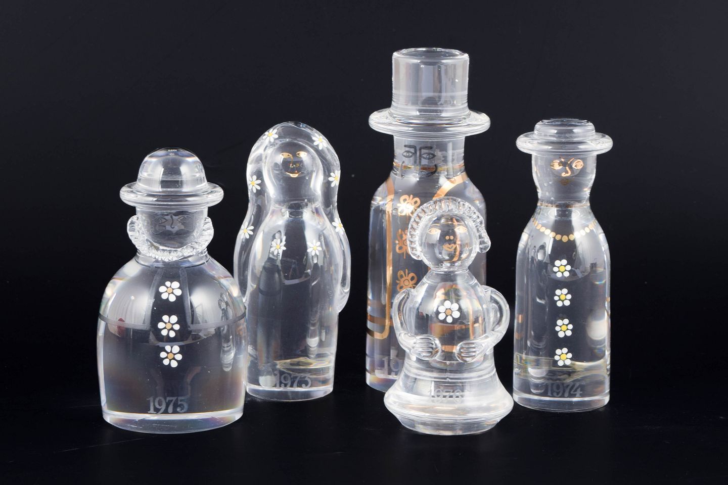 Håndlavede kunstglasfigurer i klart glas med enkle, stiliserede former og dekorative hvide og gyldne blomstermotiver, der repræsenterer en familiegruppe.