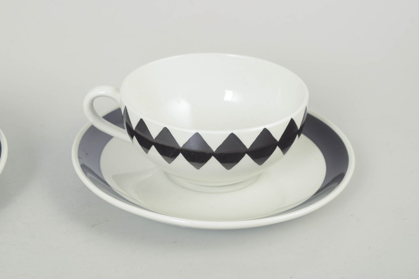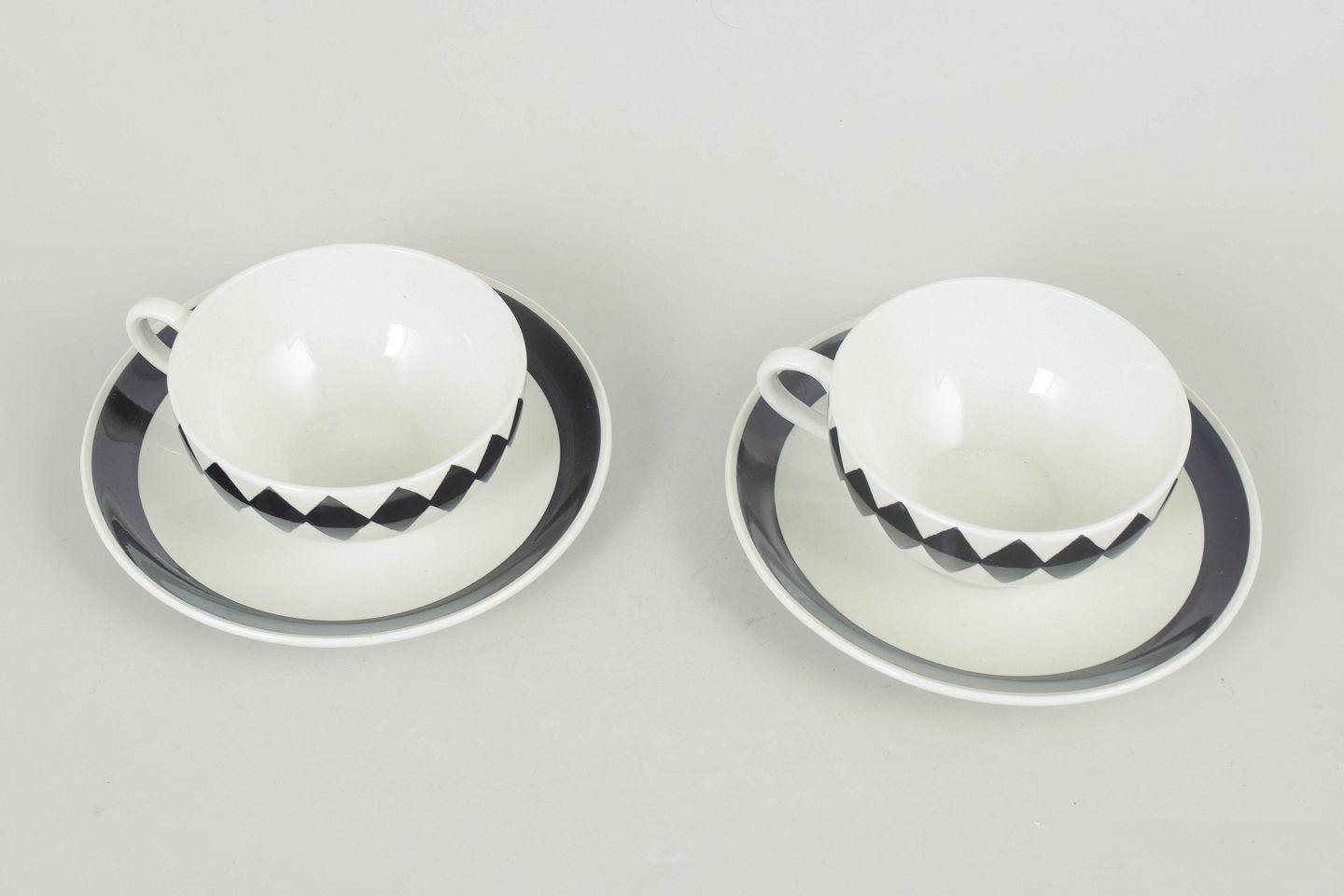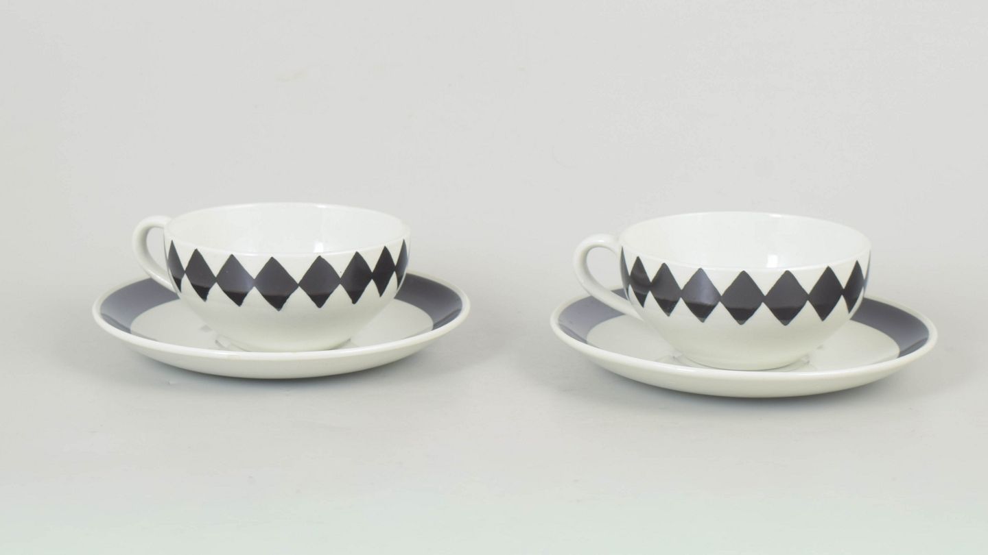 Set consisting of two teacups with matching saucers in porcelain featuring a distinctive black diamond pattern, designed in a simple and functional style typical of the period.