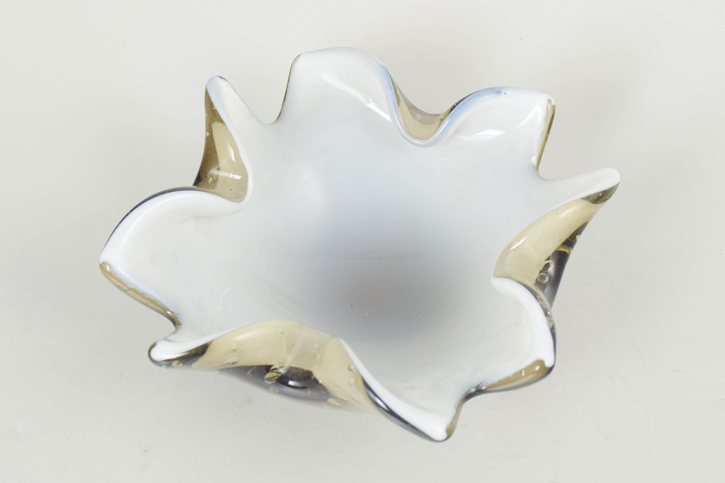 Decorative mouth-blown bowl with organic form, undulating rim and controlled air bubbles in clear and golden glass.