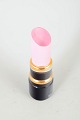 Slankt opbygget glasskulptur i form af en læbestift, i lagdelte former med cylindrisk base i mørkt glas, ringformede elementer i gyldne og klare toner samt skråt afskåret top i rosa glas.