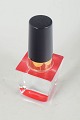Geometric glass sculpture in the form of nail polish, executed in clear and coloured glass with a solid square base and a cylindrical top in a dark tone.