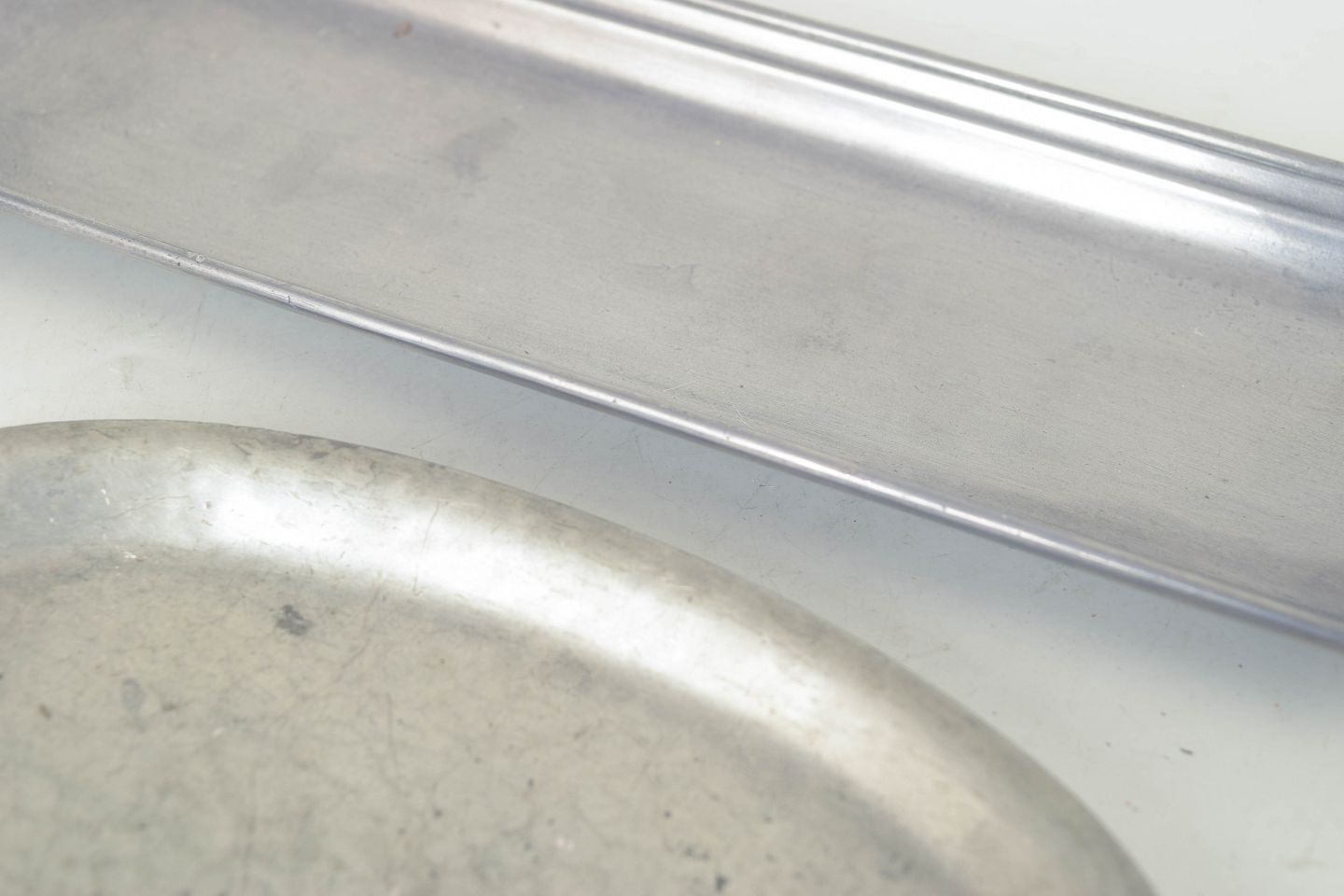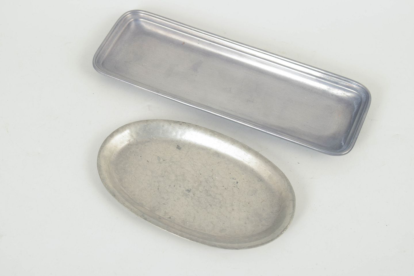 To elegante fade i tin, model 1826, udført i enkle og funktionelle former med let opadbøjede kanter. Klassisk dansk design fra mellemkrigstiden med en diskret patineret overflade.