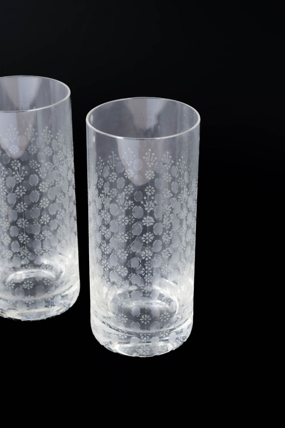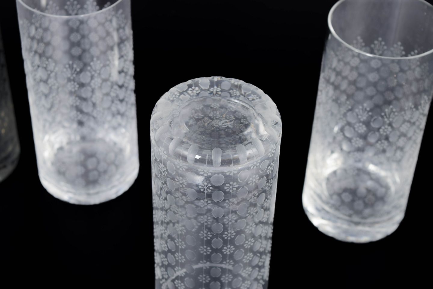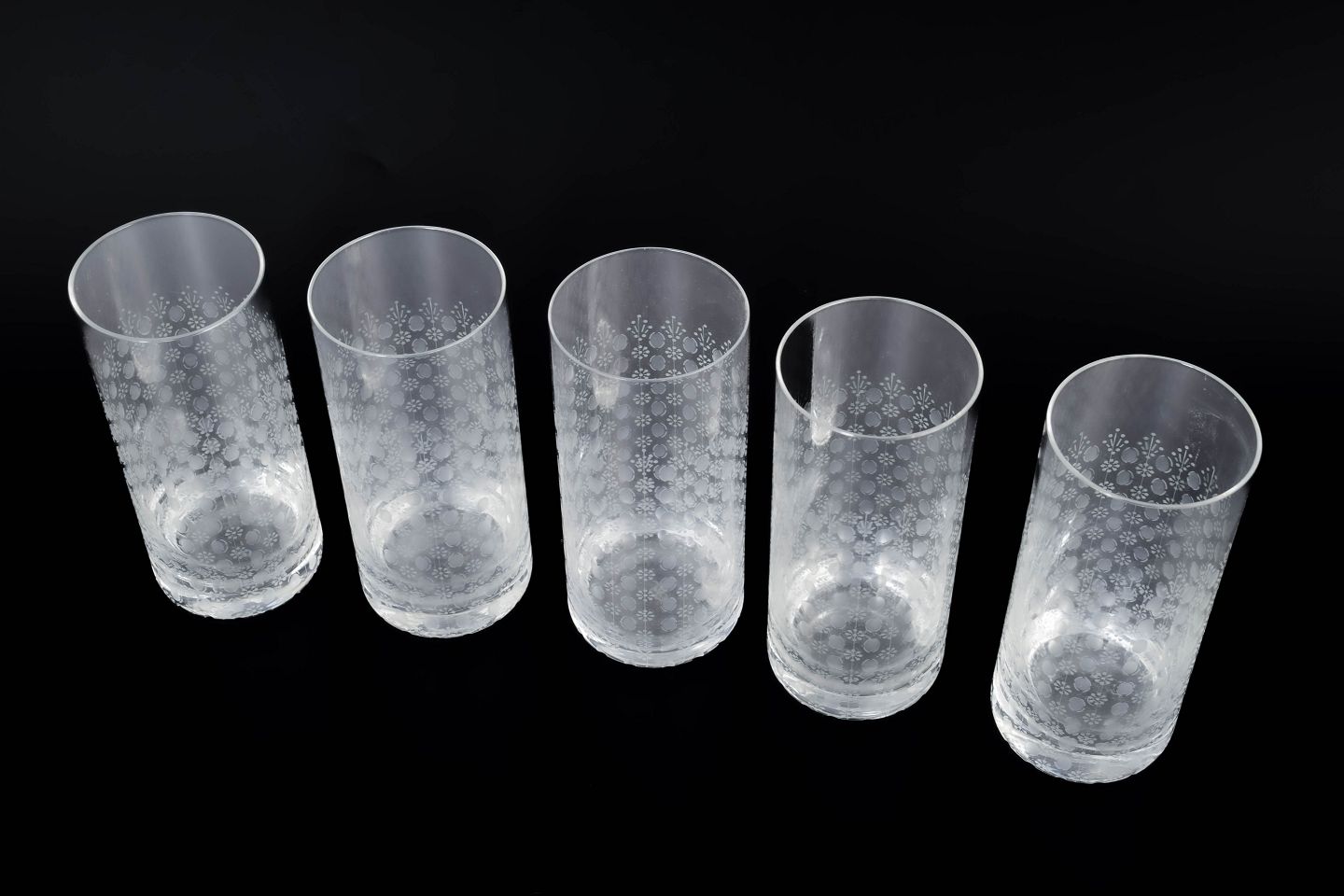 Elegant sæt af fem høje glas i klart glas med syreætsede dekorative motiver i romantisk og ornamental stil, model “Romanze”.