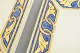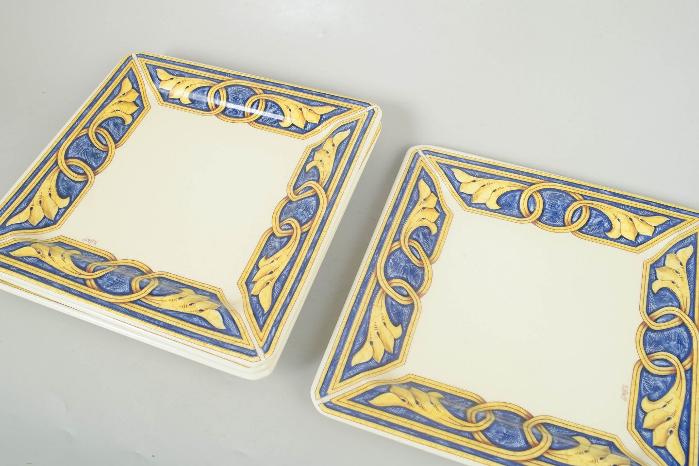 Dekorativt sæt i keramik bestående af fire middagstallerkner med bred kant dekoreret i blå, gule og gyldne toner med ornamentale mønstre.