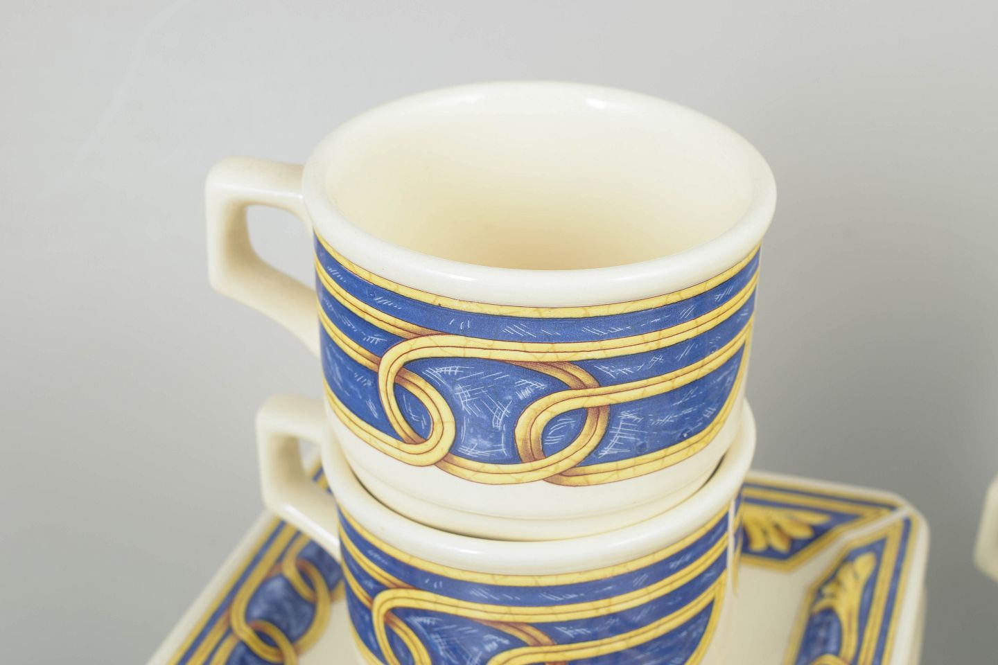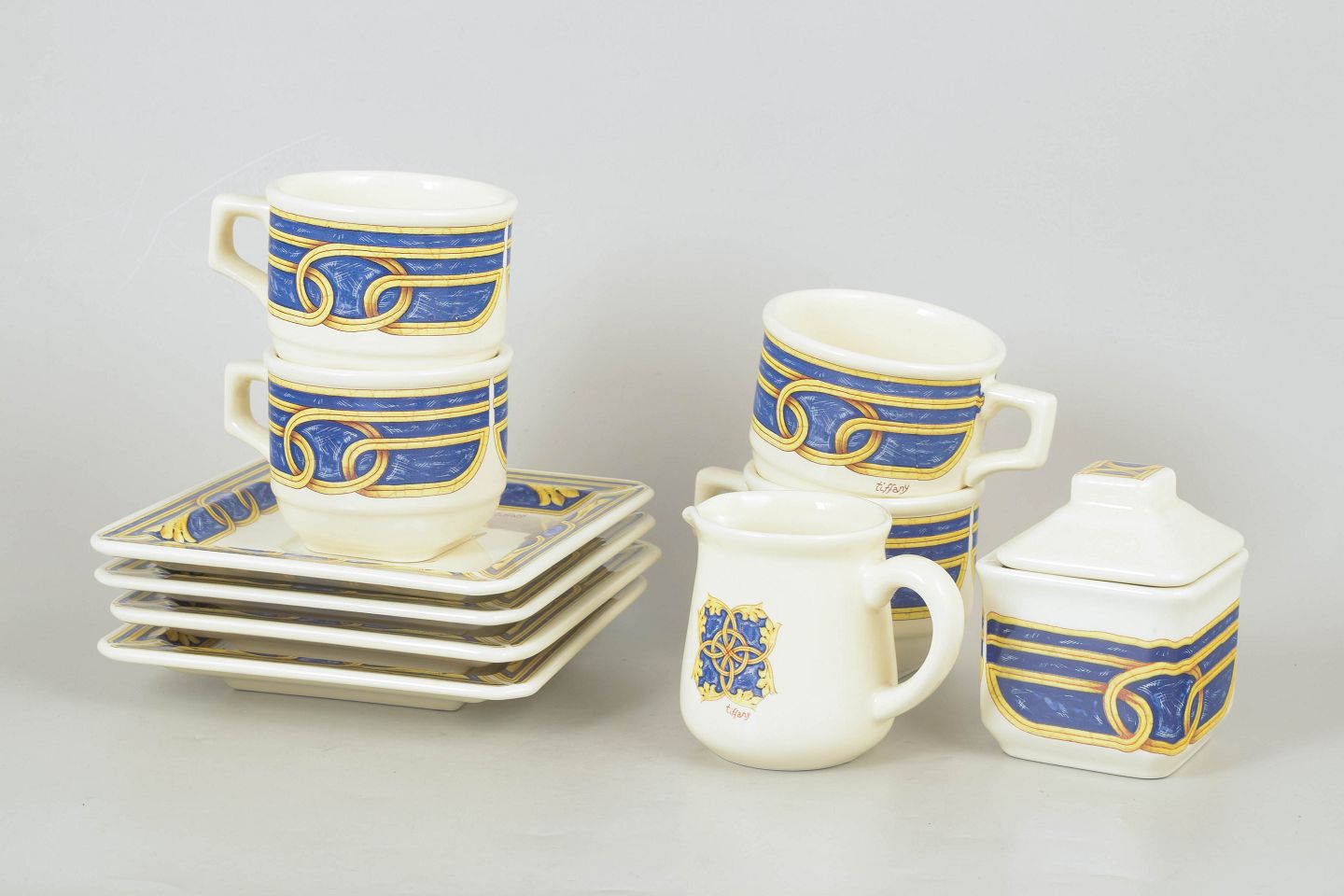 Dekorativt kaffesæt i keramik bestående af fire kaffekopper med tilhørende underkopper samt sukkerskål og flødekande, dekoreret i blå, gule og gyldne toner med ornamentale mønstre.
