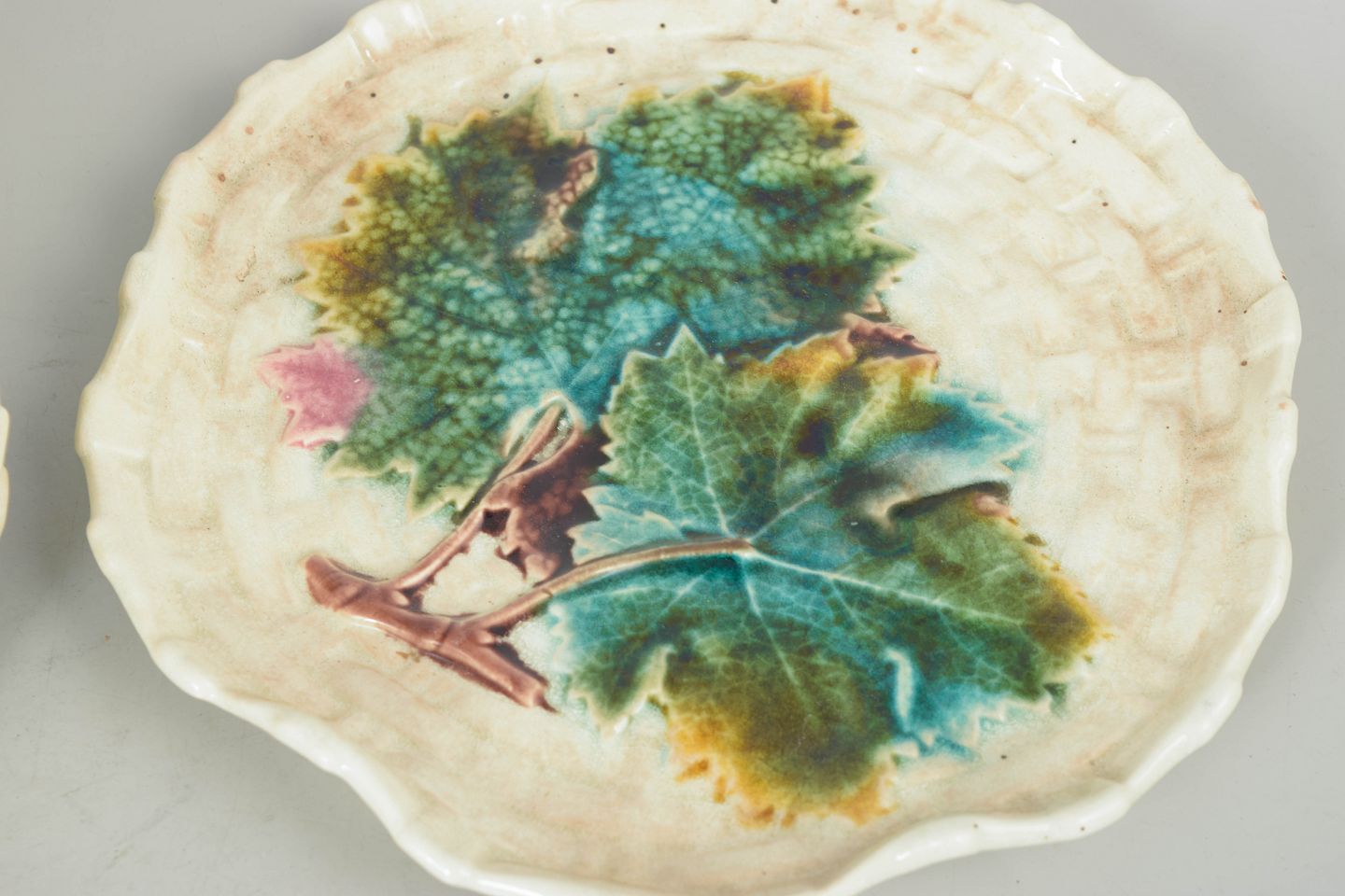 Decorative plates in glazed faience with relief moulded and naturalistic floral decoration in colourful majolica glaze. Hallmark.