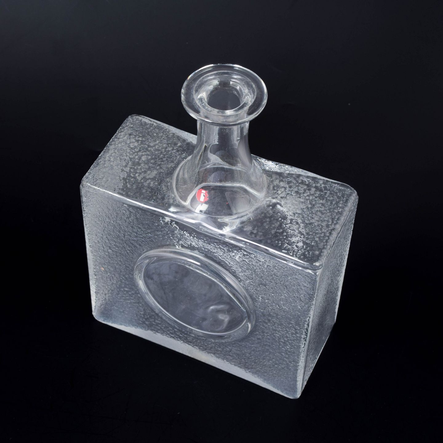 Kraftig kvadratisk glasflaske med integreret rund fordybning på fronten og kort hals. Udført i klart glas med let rå struktur på siderne. Original producentmærkat bevaret.