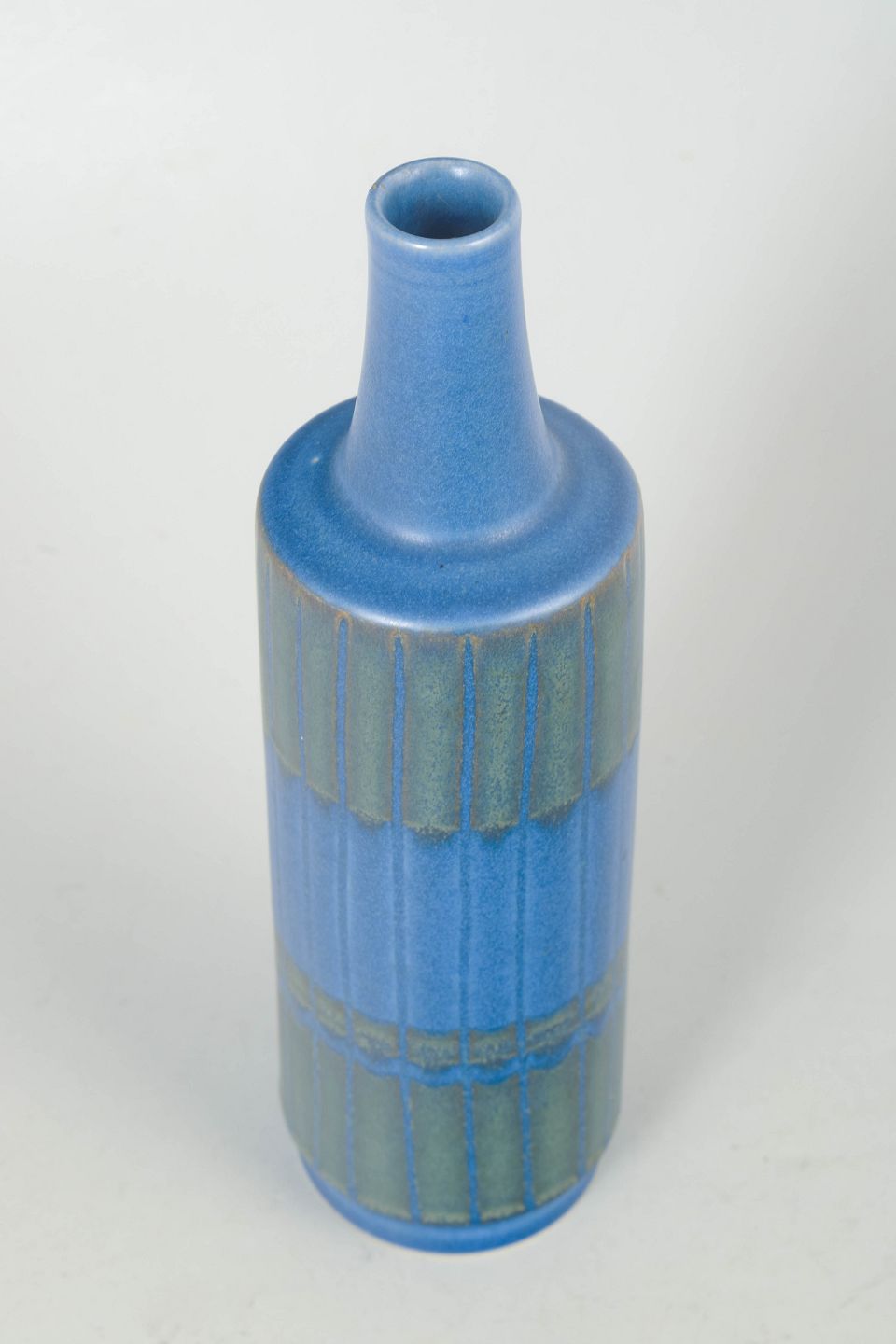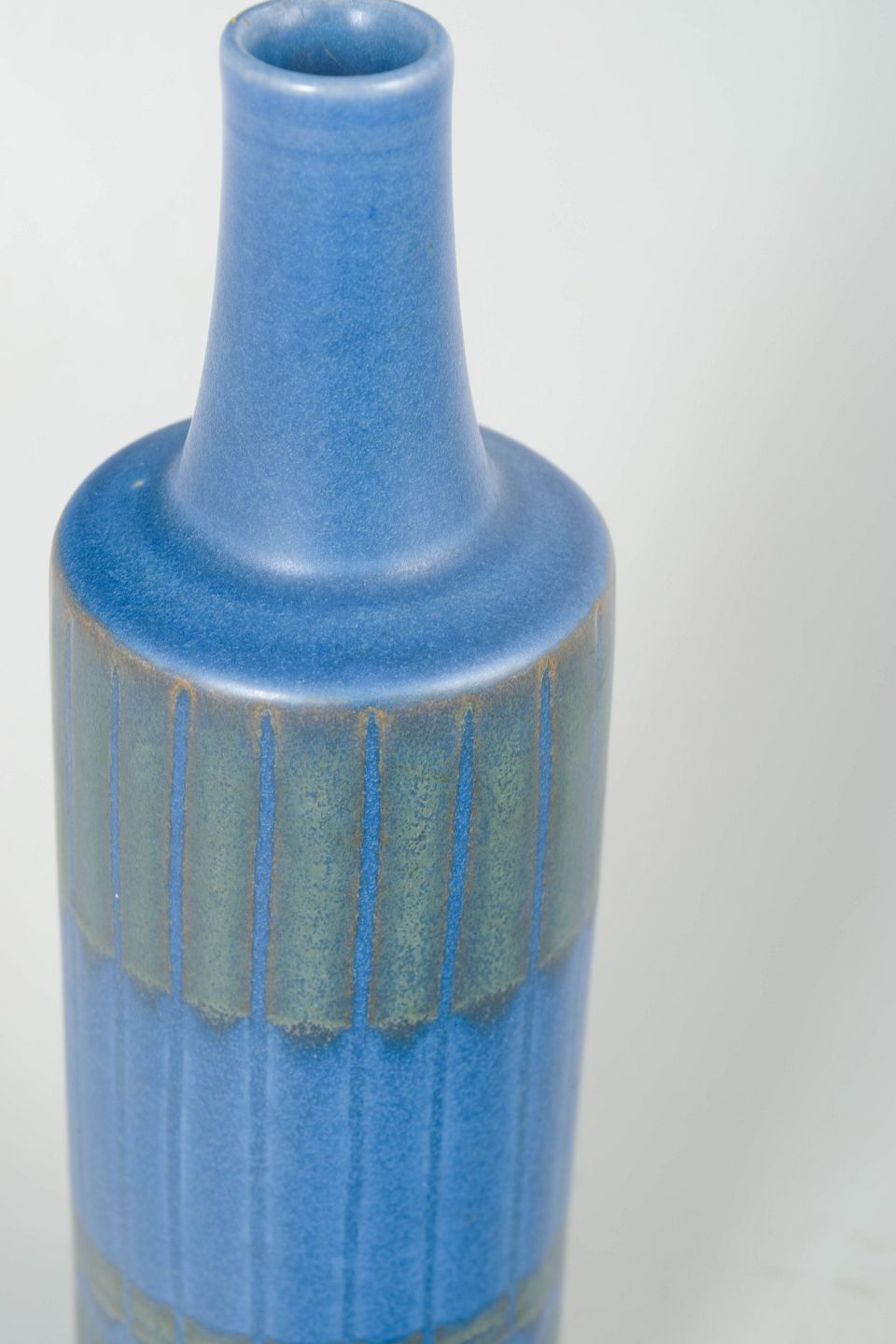 Slank cylinderformet vase i stentøj med lodrette rifler og blå glasur med grønne nuancer og dekorative bånd.