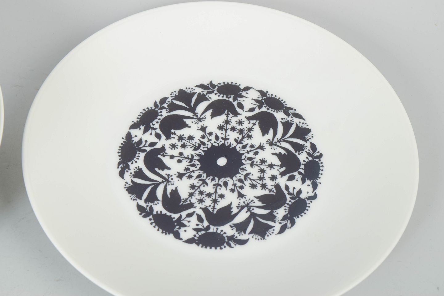 Tallerkener fra Hilton-serien i porcelæn med karakteristisk sort dekoration i midten på hvid bund.