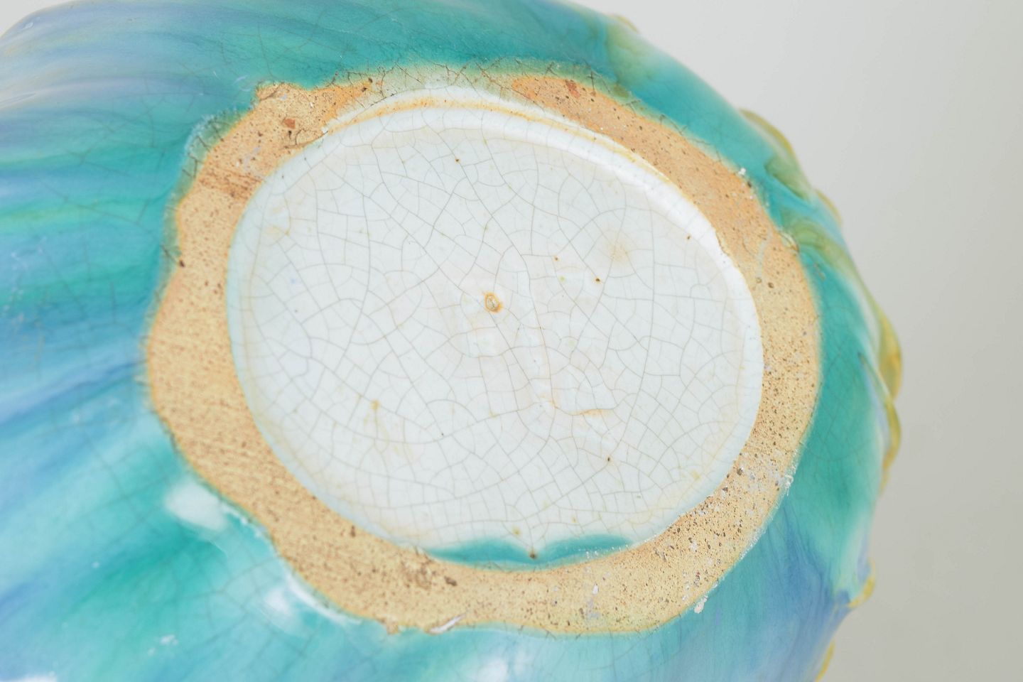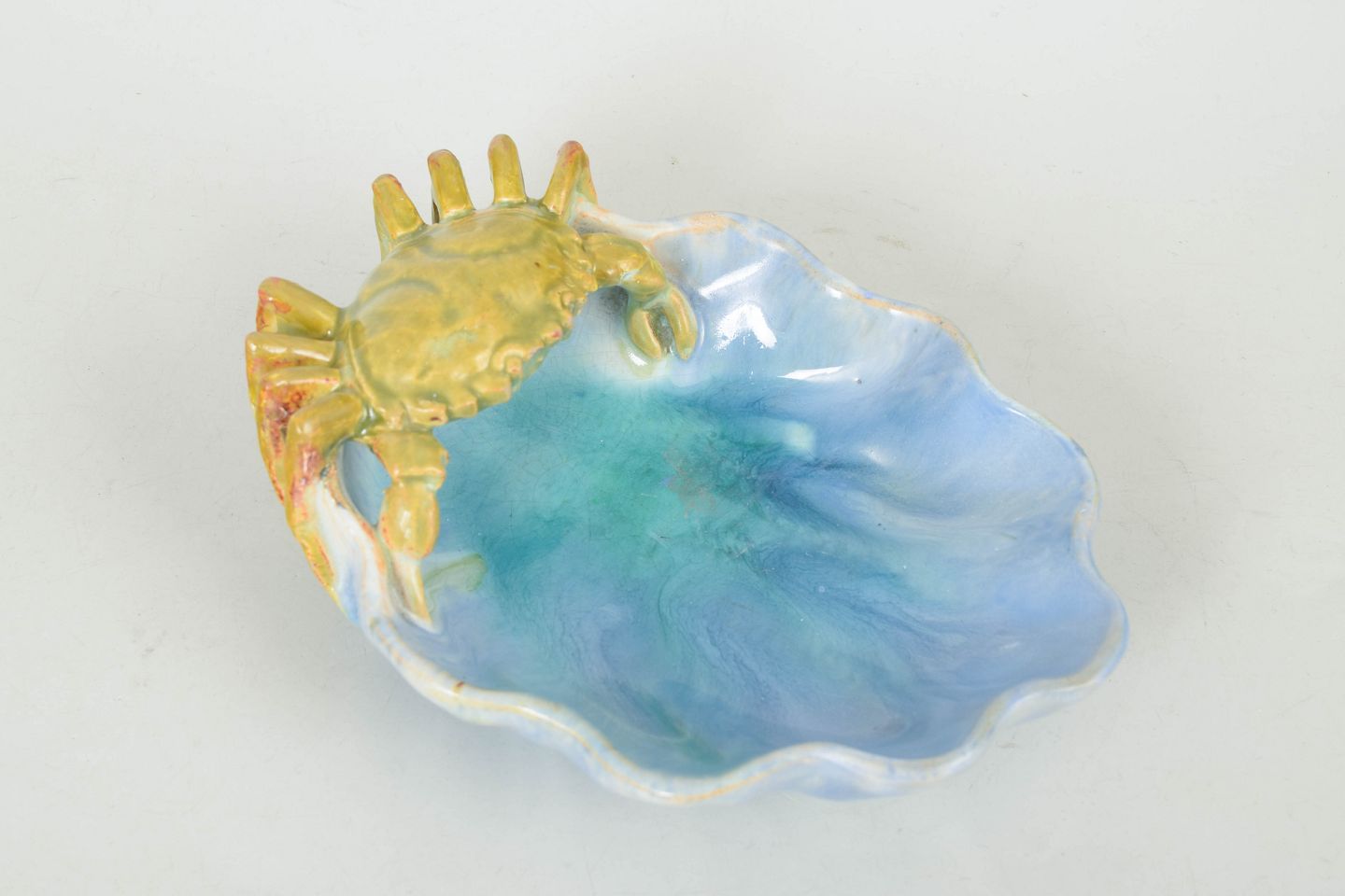 Organisk formet skål i keramik med bølget rand og integreret krabbemotiv, udført i iriserende glasur med nuancer i blå, grøn og gylden. Mærket utydeligt.
