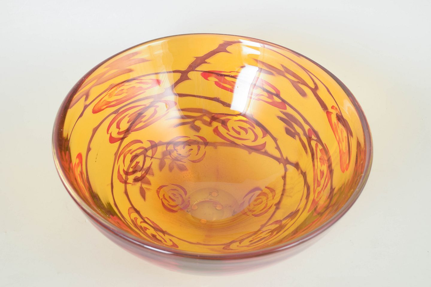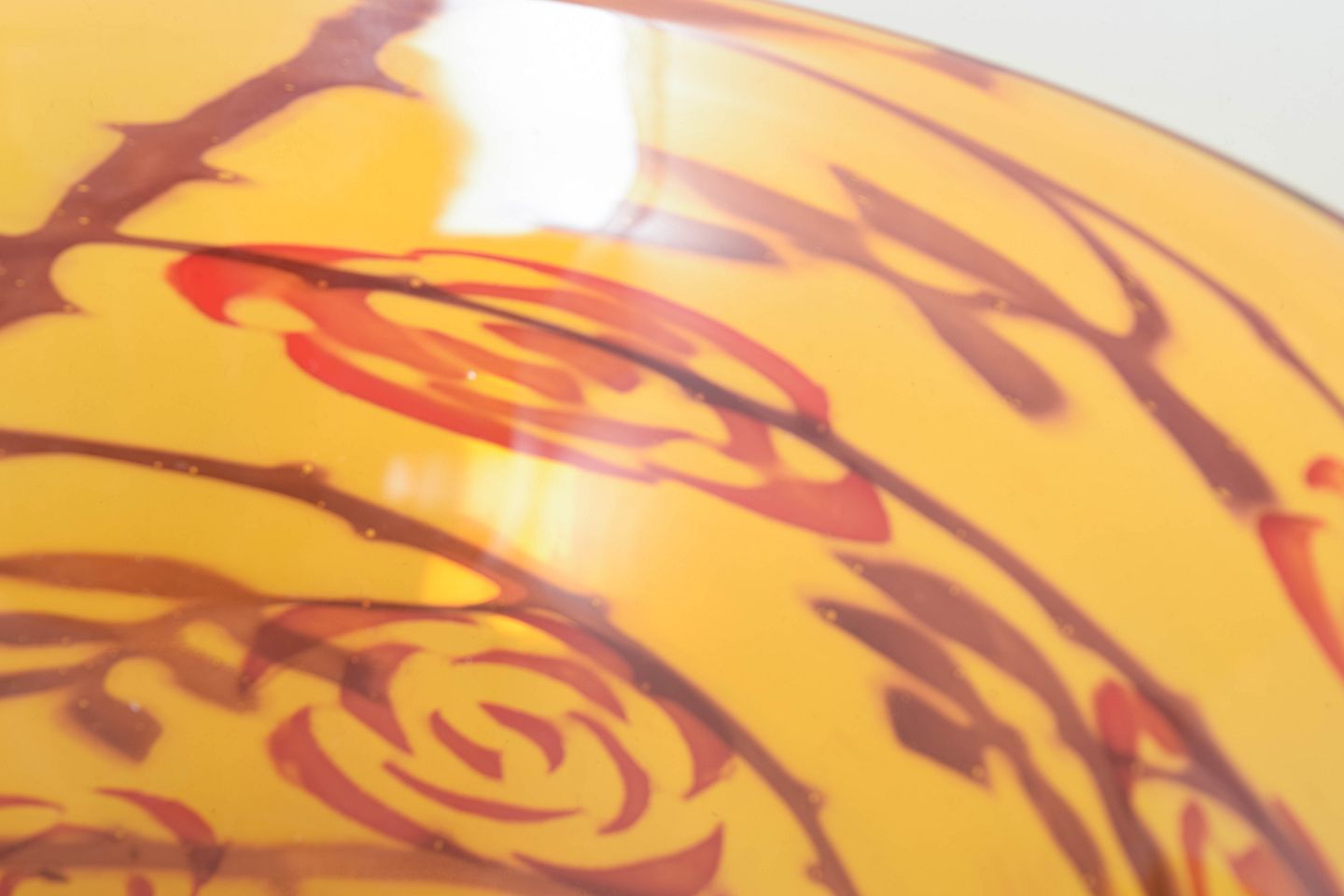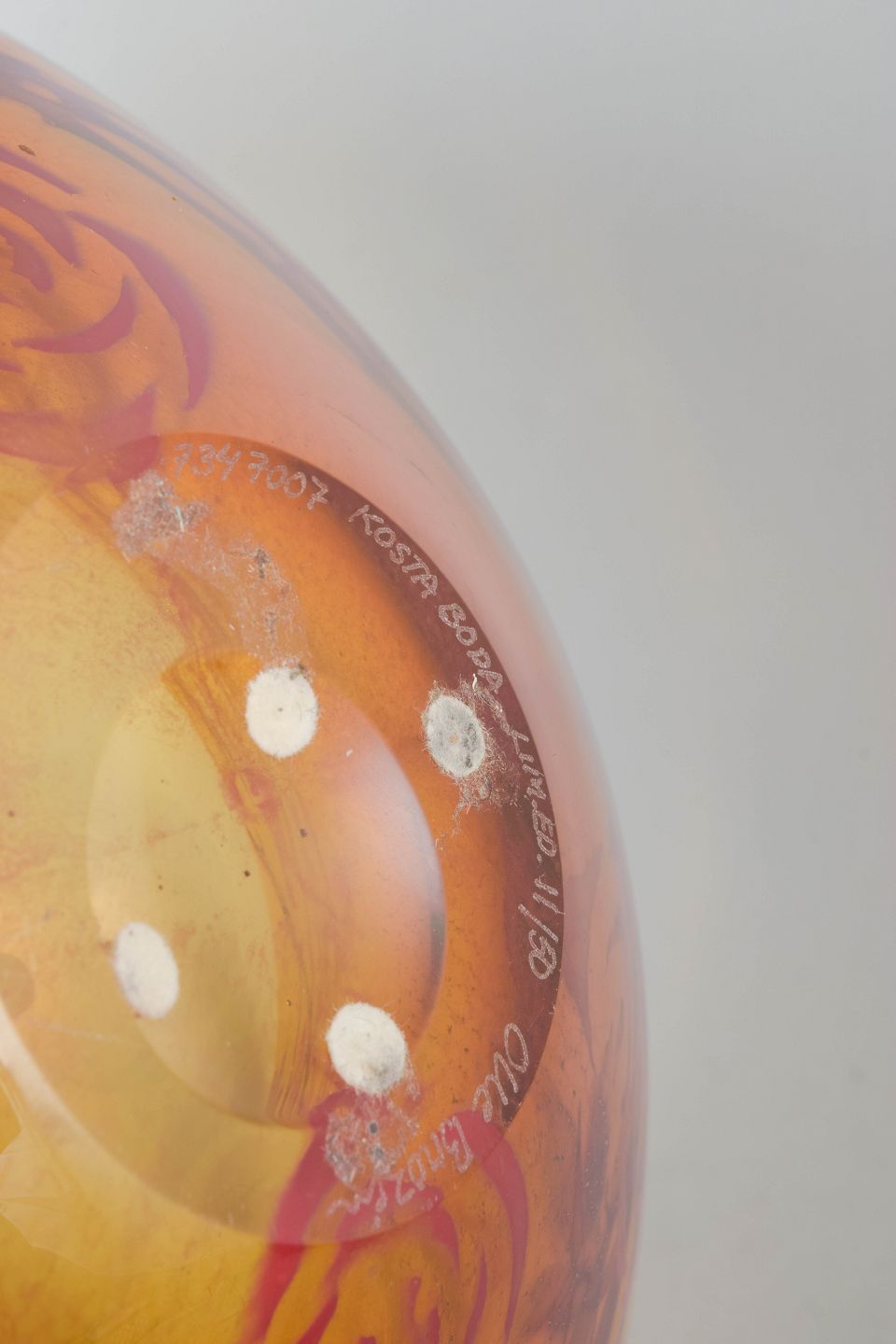 Stor skål i mundblæst glas med varmtonet farvespil i orange, rav og røde nuancer med dekorativt mønster. Signeret i bunden Kosta Boda, model 7347007, oplag 11/50.